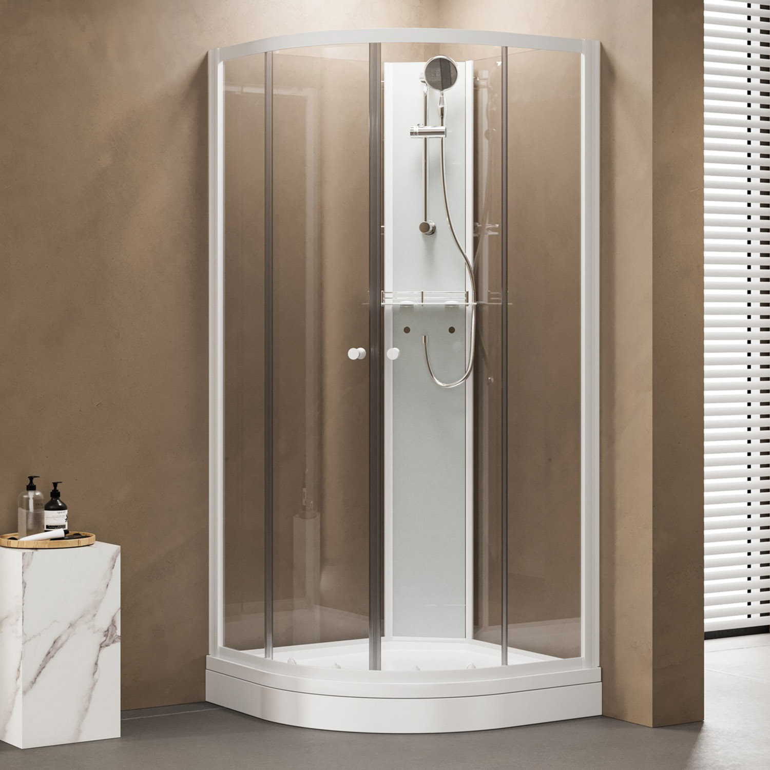 1904 Otra dusjkabinett kommer i str. 90×90 cm, med klart glass i front, hvitt dusjkar og dusjgarnityr i krom. Du kan velge mellom hvite glassvegger eller klare glassvegger i bakkant.