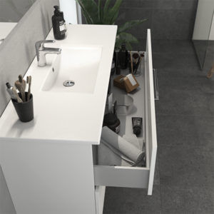 Du kan velge mellom servantskap med skuffer eller dører. Med skuffene får du enkel tilgang til for eksempel kremer og sminke. Både dører og skuffer lukkes dempet med soft-close og kan finjusteres etter behov. Et elegant metall håndtak i krom følger med hver front. Frontene er tilpasset badet for daglig bruk og er lette å holde rene.