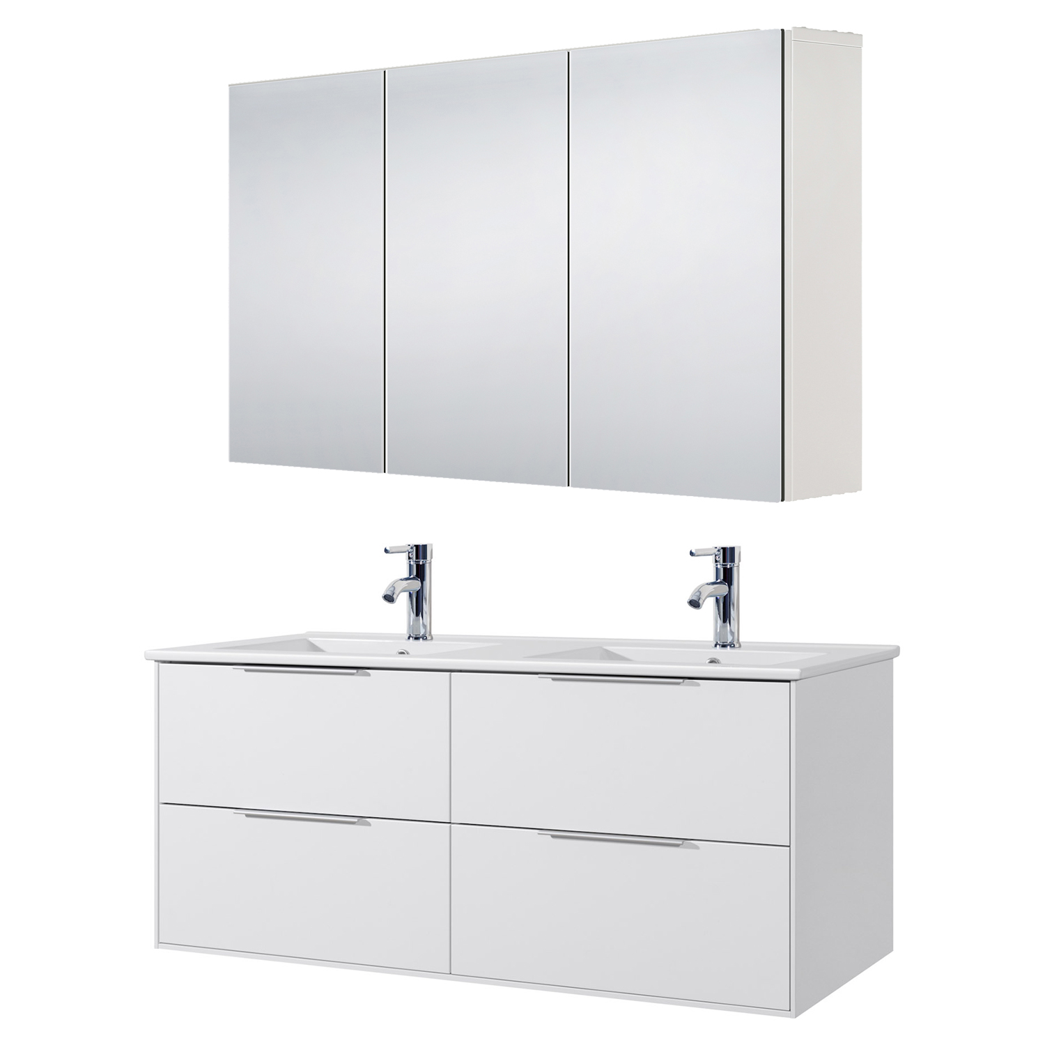 Baderomsmøbelet har fronter i hvit matt MDF, myktgående glideskinner og håndtak i aluminium. a-collection servant slim i porselen. Speilskapet har utførelse i fuktbestandig MDF med pålimt kobberfritt speil. Dørene har mykt stengende hengsler og innredningen komplementeres av medfølgende glasshylle. Servantkran medfølger ikke.