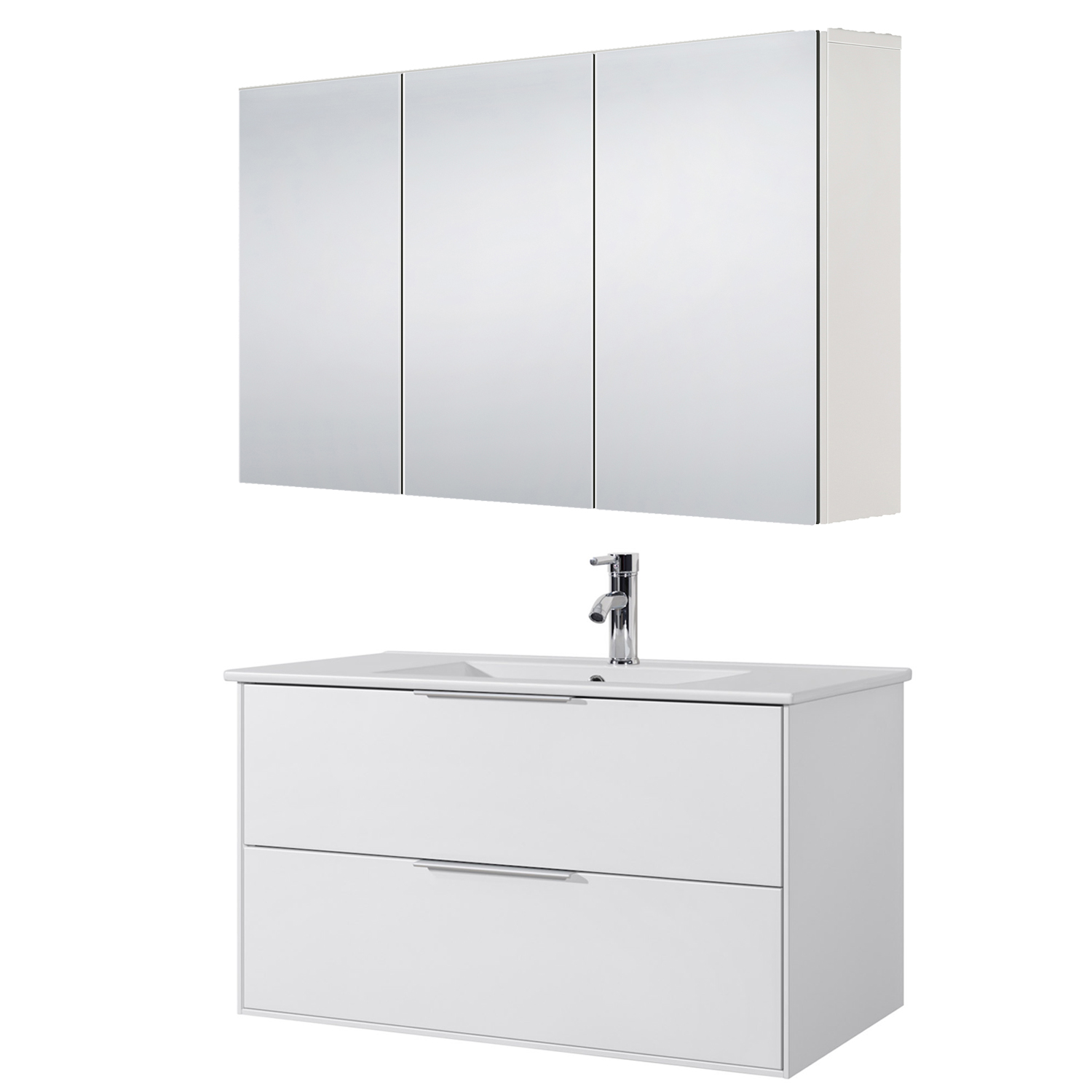 Baderomsmøbelet har fronter i hvit matt MDF, myktgående glideskinner og håndtak i aluminium. a-collection servant slim i porselen. Speilskapet har utførelse i fuktbestandig MDF med pålimt kobberfritt speil. Dørene har mykt stengende hengsler og innredningen komplementeres av medfølgende glasshylle. Servantkran medfølger ikke.