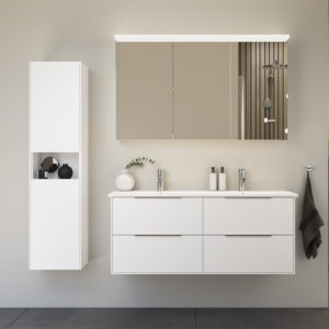 Baderomsmøbelet har fronter i hvit matt MDF, myktgående glideskinner og håndtak i aluminium. a-collection servant slim i porselen. Speilskapet har utførelse i fuktbestandig MDF med pålimt kobberfritt speil. Dørene har mykt stengende hengsler og innredningen komplementeres av medfølgende glasshylle. Servantkran medfølger ikke.