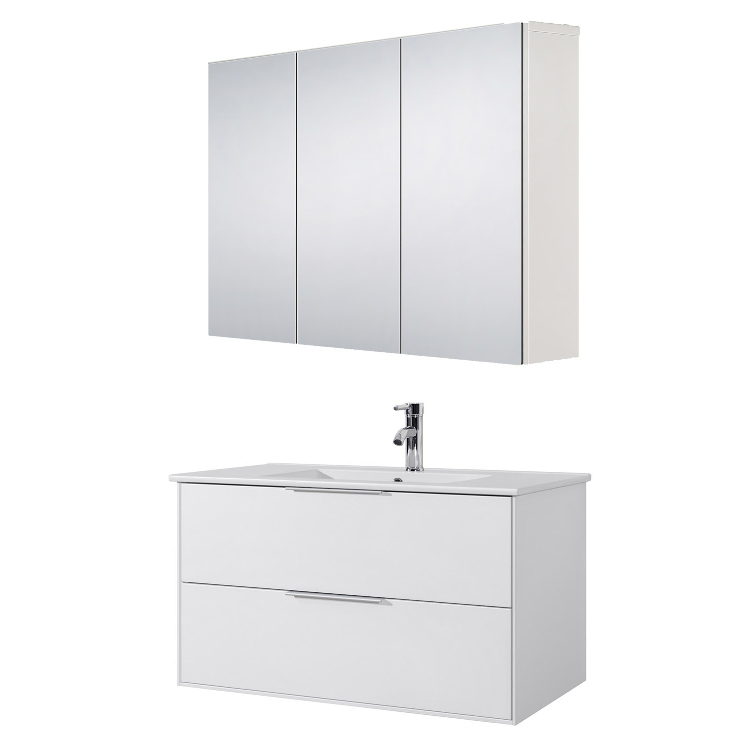 Baderomsmøbelet har fronter i hvit matt MDF, myktgående glideskinner og håndtak i aluminium. a-collection servant slim i porselen. Speilskapet har utførelse i fuktbestandig MDF med pålimt kobberfritt speil. Dørene har mykt stengende hengsler og innredningen komplementeres av medfølgende glasshylle. Servantkran medfølger ikke.