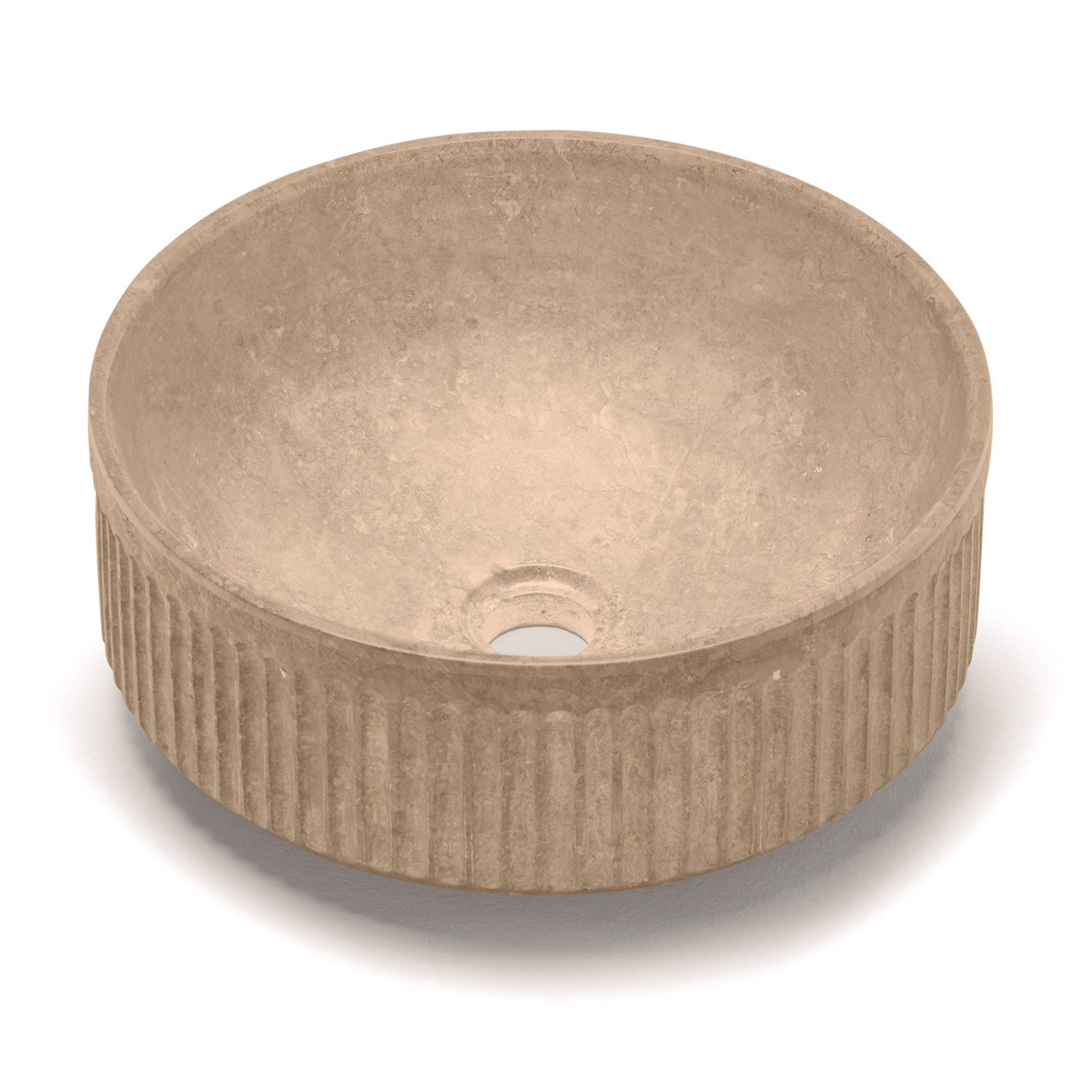 Fine detaljer med rillemønster på utsiden av servanten. Denne servanten utstråler en tidløs skjønnhet, og marmoren gir et unikt preg. En perfekt forening av luksus og eleganse.