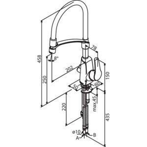 Høy kjøkkenkran med pene avrundede former og praktisk fleksibel tut som hektes av festet for enkelt skylling av kjøkkenkummen.