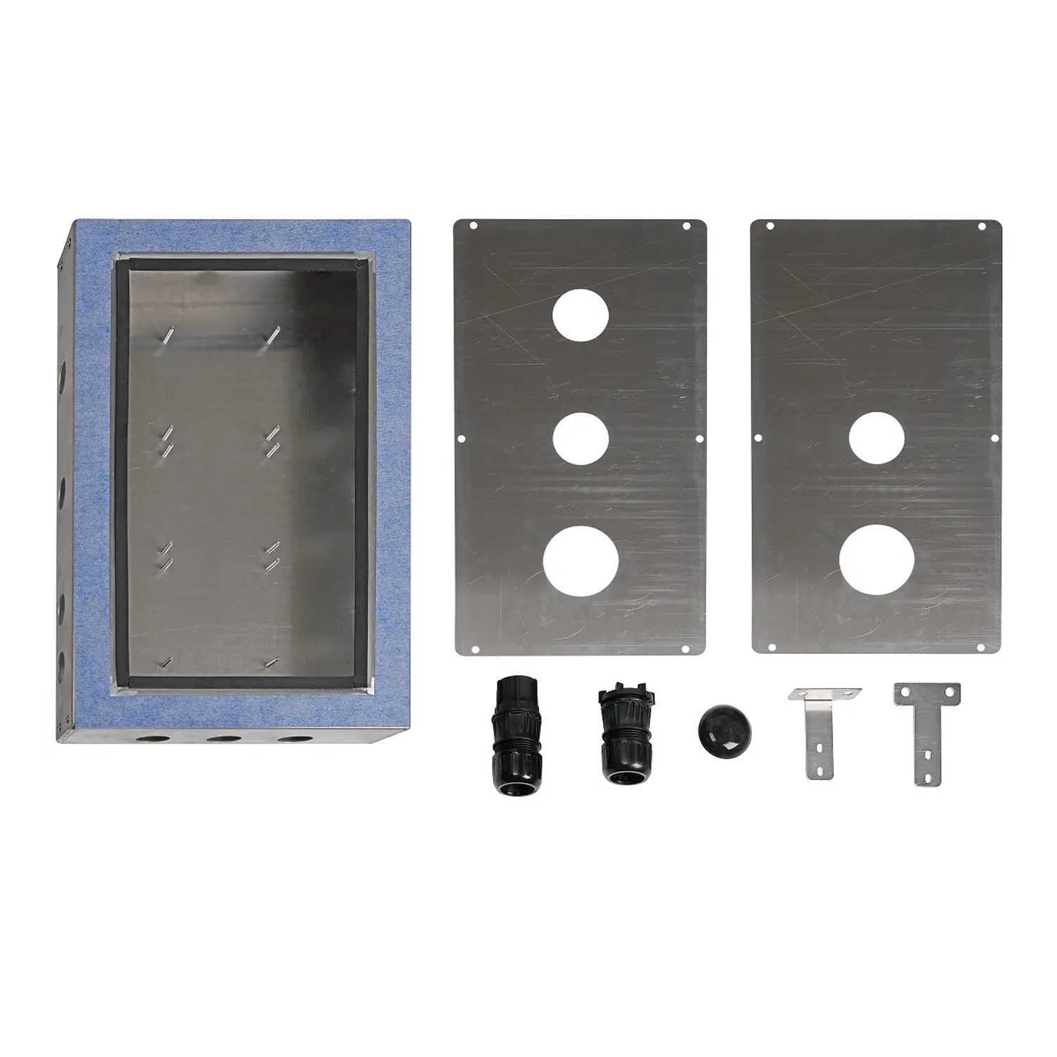 Sikkerhetsboks til takdusj for innbygging og badekarkran for innbygging med rosetter. Boksen kan plasseres både vertikalt og horisontalt. Etter installasjon skal det utføres trykktest og tetthetskontroll med installasjonstrykk. Det medfølger plate for både 3 og 2 reguleringer i pakken.