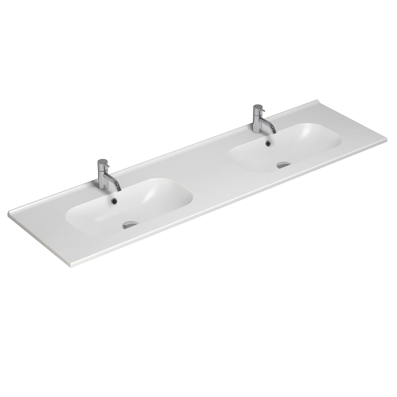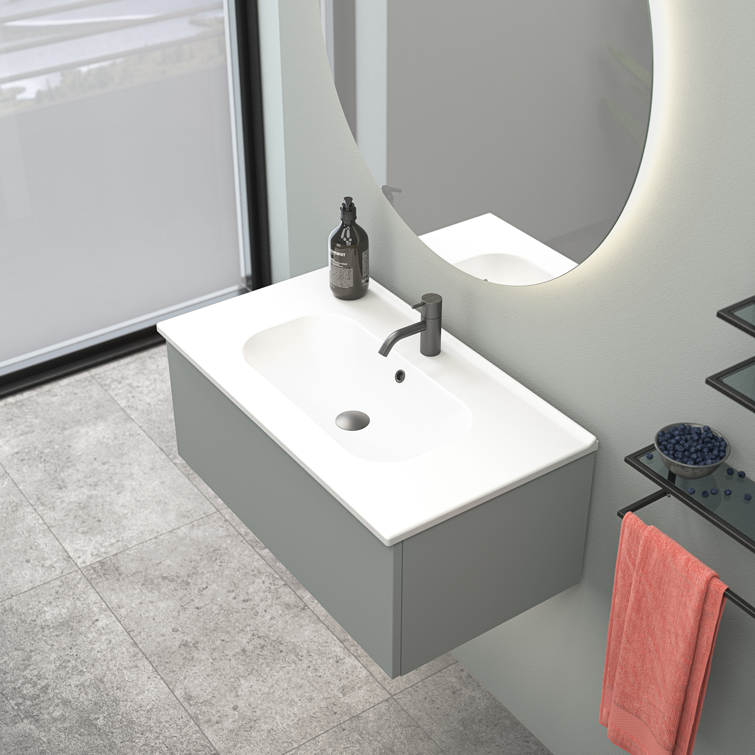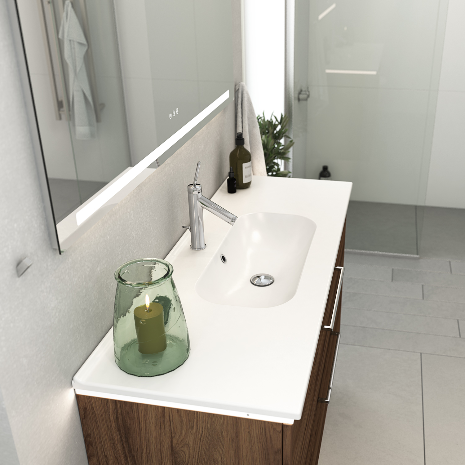 Rette linjer og ovalt basseng med god plass rundt. Sanitærporselen er et sterkt, keramisk materiale med et mykt og avrundet design på alle kanter, både i bassenget og benkeplaten. Overflaten er hard, glatt og blank, og de avrundede kantene gjør den svært rengjøringsvennlig. Servanter i sanitærporselen krever minimalt vedlikehold – selv etter mange års bruk. Servanten tåler ikke skuremidler.