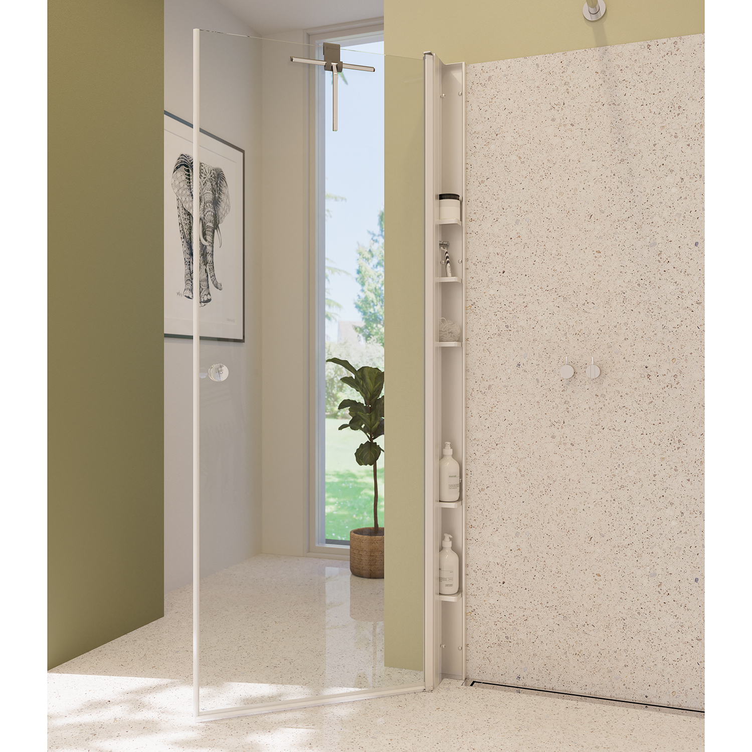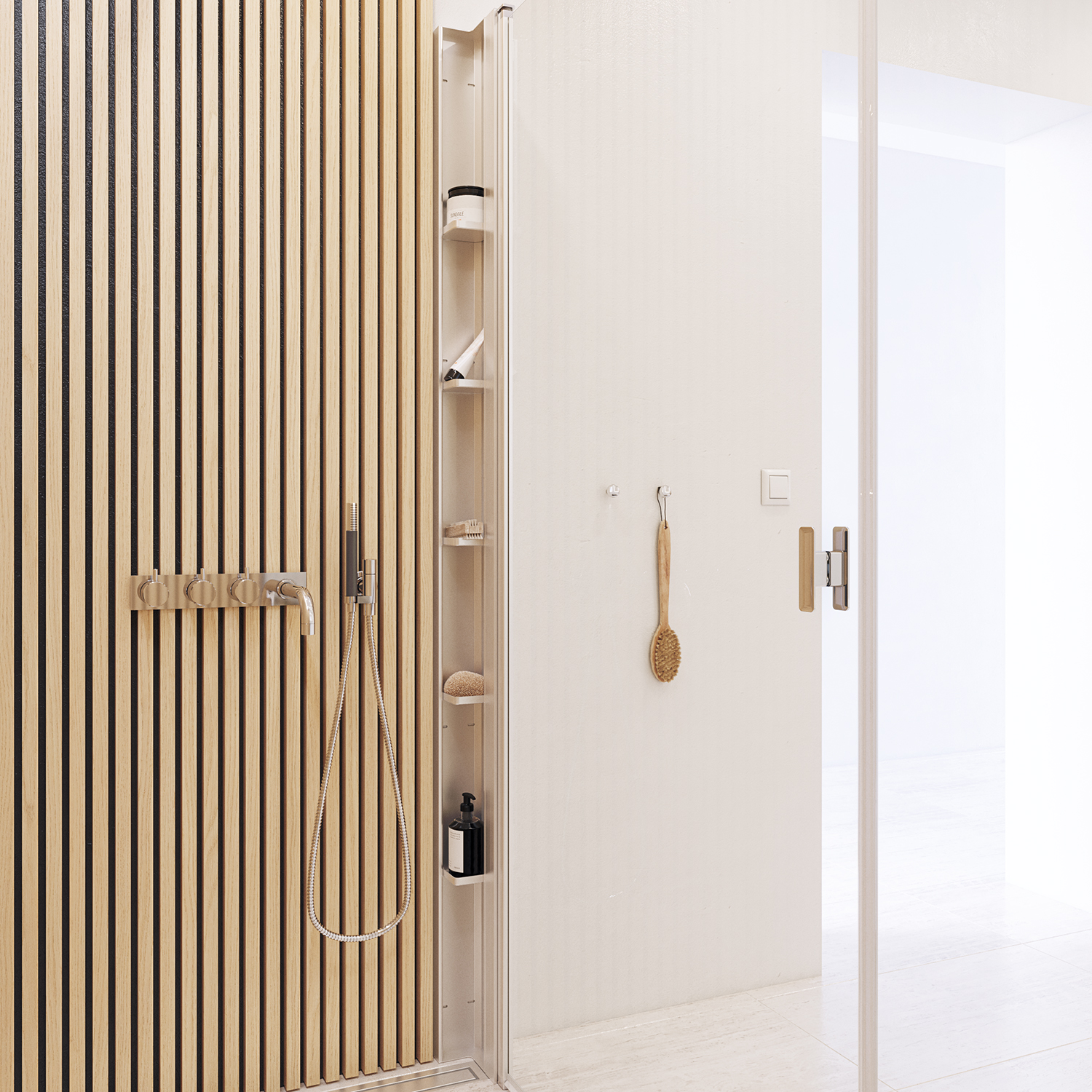 OBS: Velg 10 cm smalere dør om du kombinerer med Tower dusjhylle (vist på bilde med spilevegg)