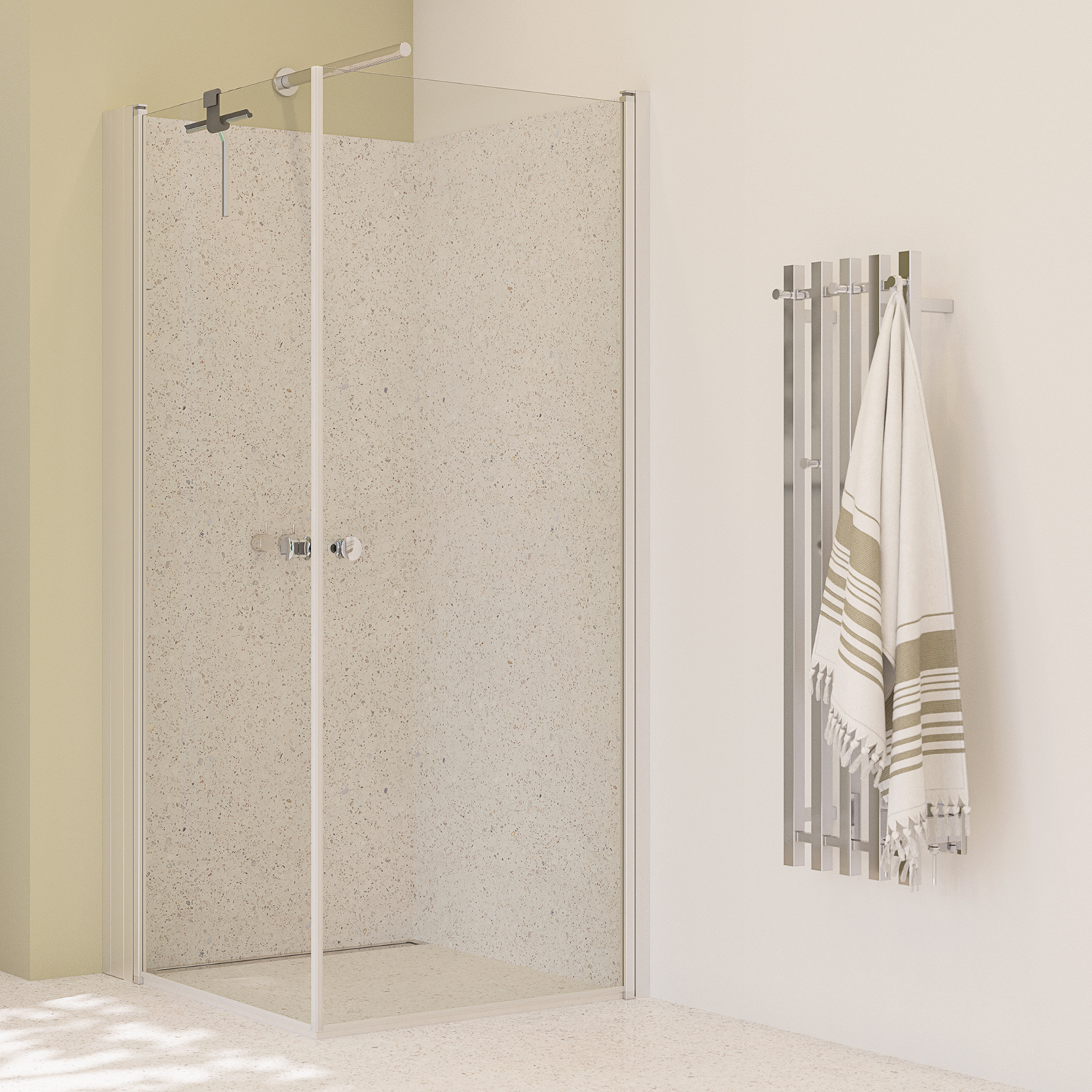 Døren(e) er svært praktisk og brukervennlig, ettersom den kan åpnes både innover og utover. Dermed kan du frigjøre plass på badet når dusjen ikke er i bruk. Svingdøren(e) åpnes og lukkes enkelt og lydløst med slitesterke hengsler, noe som sikrer uproblematisk tilgang til dusjen. Samtidig gir den en effektiv avskjerming som holder vannet inne i dusjen og resten av badet tørt og rent.