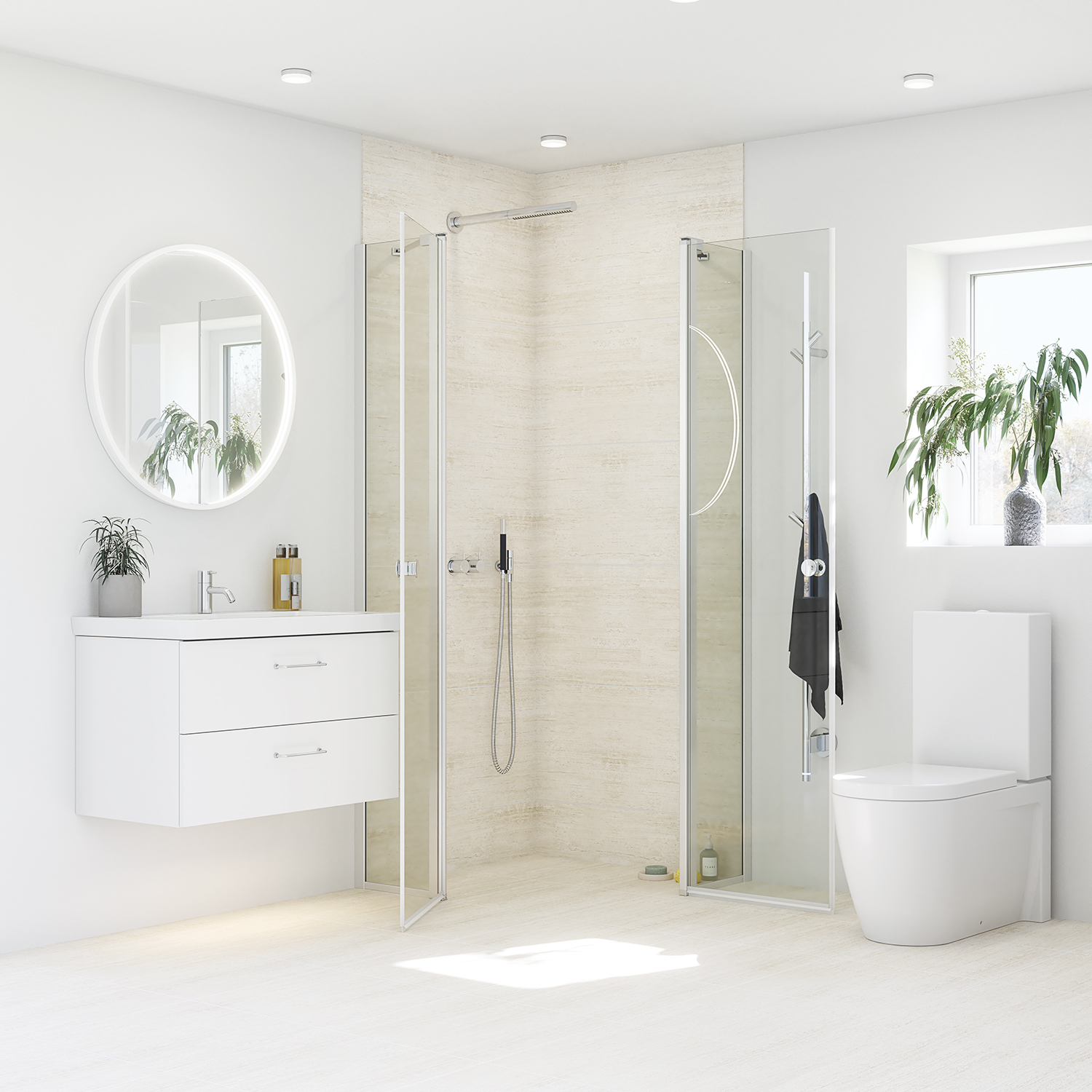 Dansani svingdør med sidepanel gir stabil og elegant avskjerming rundt dusjen, reduserer vannsøl og skaper privatliv. Du kan plassere møbler nær dusjhjørnet, noe som er praktisk på små bad. Den innebygde svingdøren skyves enkelt inn uten å treffe blandebatteriet, slik at du får mer plass når dusjen ikke er i bruk. Herdet sikkerhetsglass med EasyCare-behandling sikrer lang holdbarhet og sikkerhet. Med Dansani svingdør og sidepanel får du både en stilfull og funksjonell løsning til badet ditt.