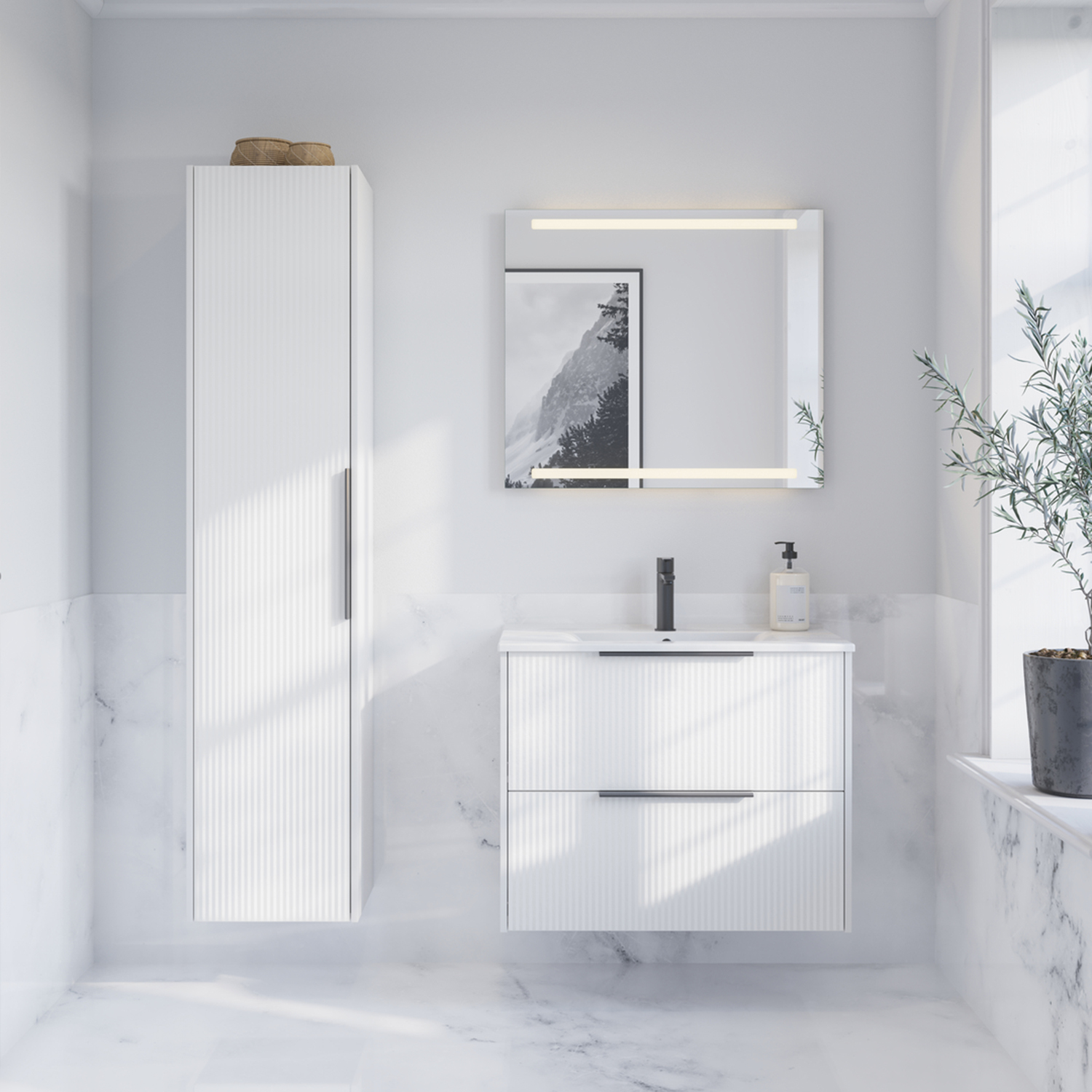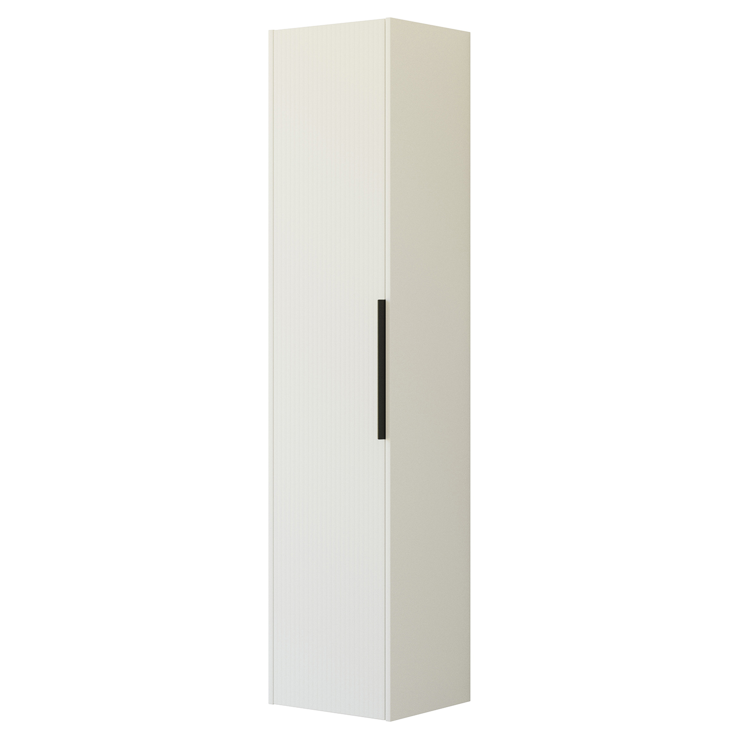 Dette høyskapet kombinerer fleksibiliteten til en vendbar dør med en elegant stripete front som gir et moderne preg til badet ditt. Innvendig finner du en trehylle og fire glasshyller, noe som gir deg god plass til å organisere toalettartiklene dine. Skapet er tilgjengelig i hvitt, sandfarget eller lyseblått, og det monterte håndtaket gjør skapet klart til umiddelbar bruk.