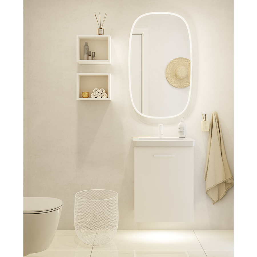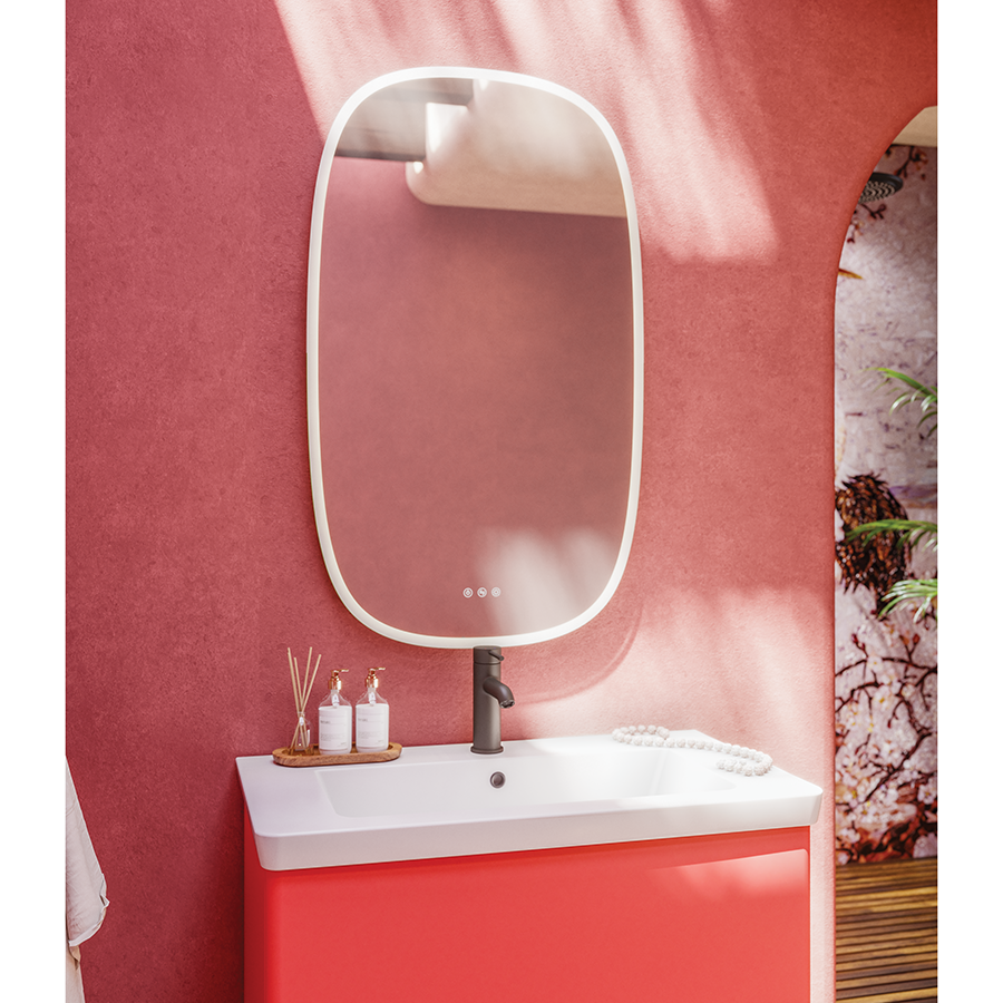 Squircle-speilet har en elegant superellipseform – en harmonisk blanding av runde og firkantede linjer som skaper balanse og dybde i baderomsinnredningen. Den unike formen gir badet et moderne og dynamisk uttrykk, samtidig som speilet fungerer som en effektiv lyskilde.
