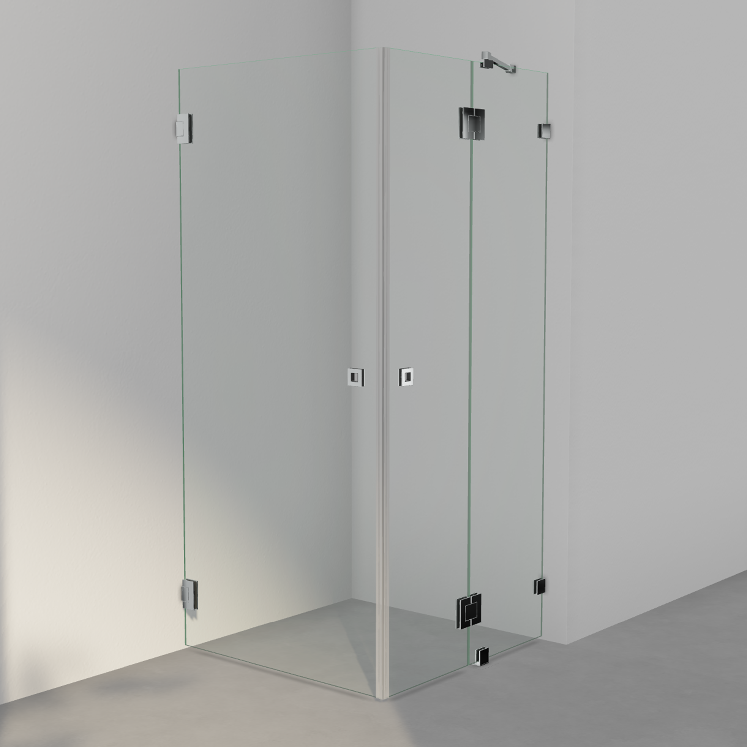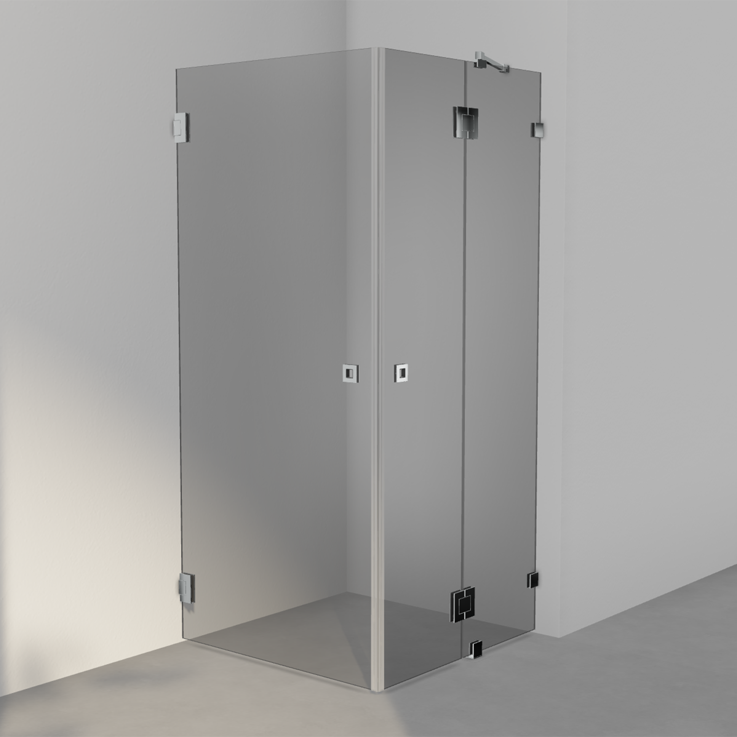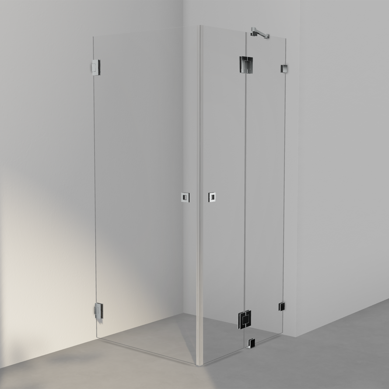 Dusjhjørne med en mindre fast vegg og to dører i 8 mm glass