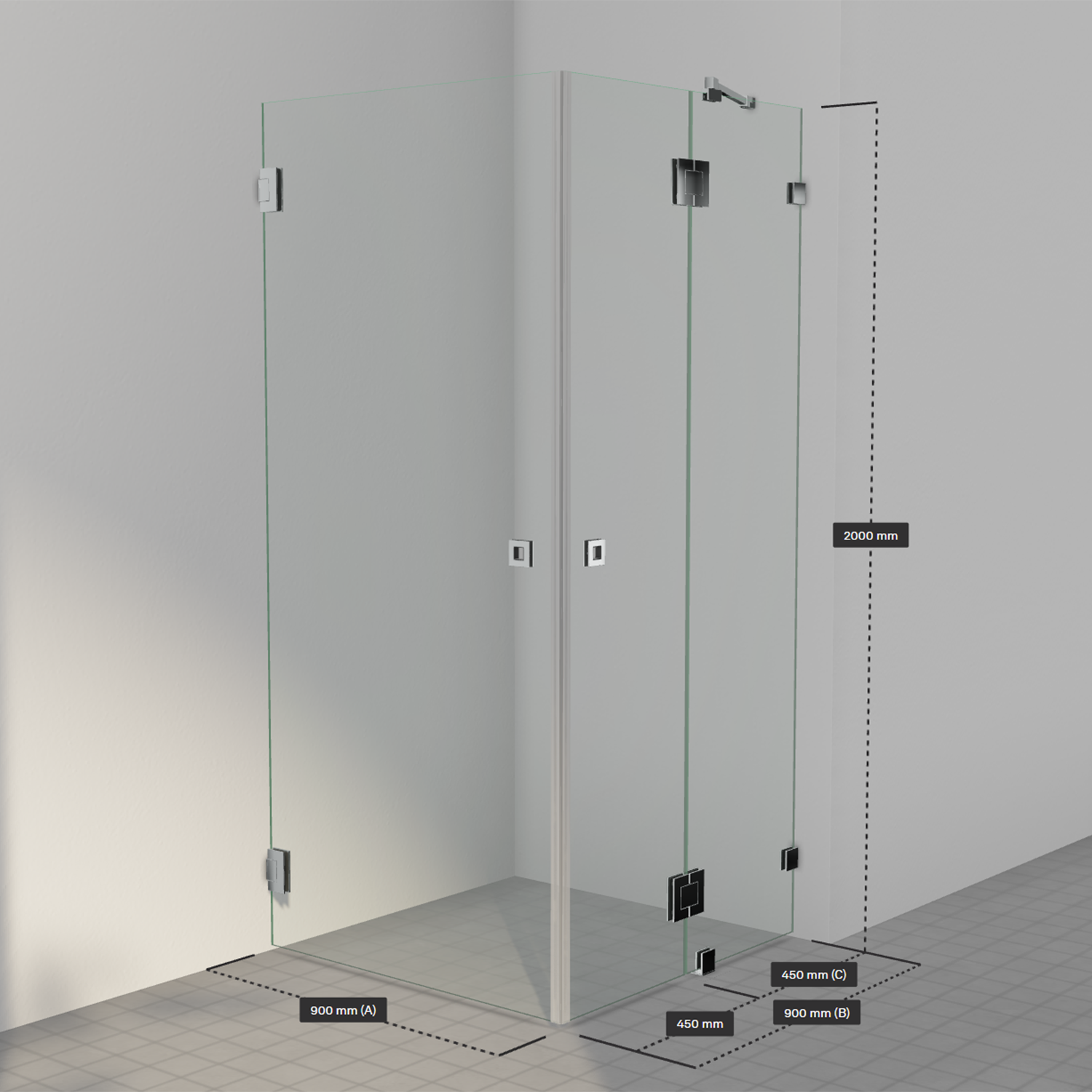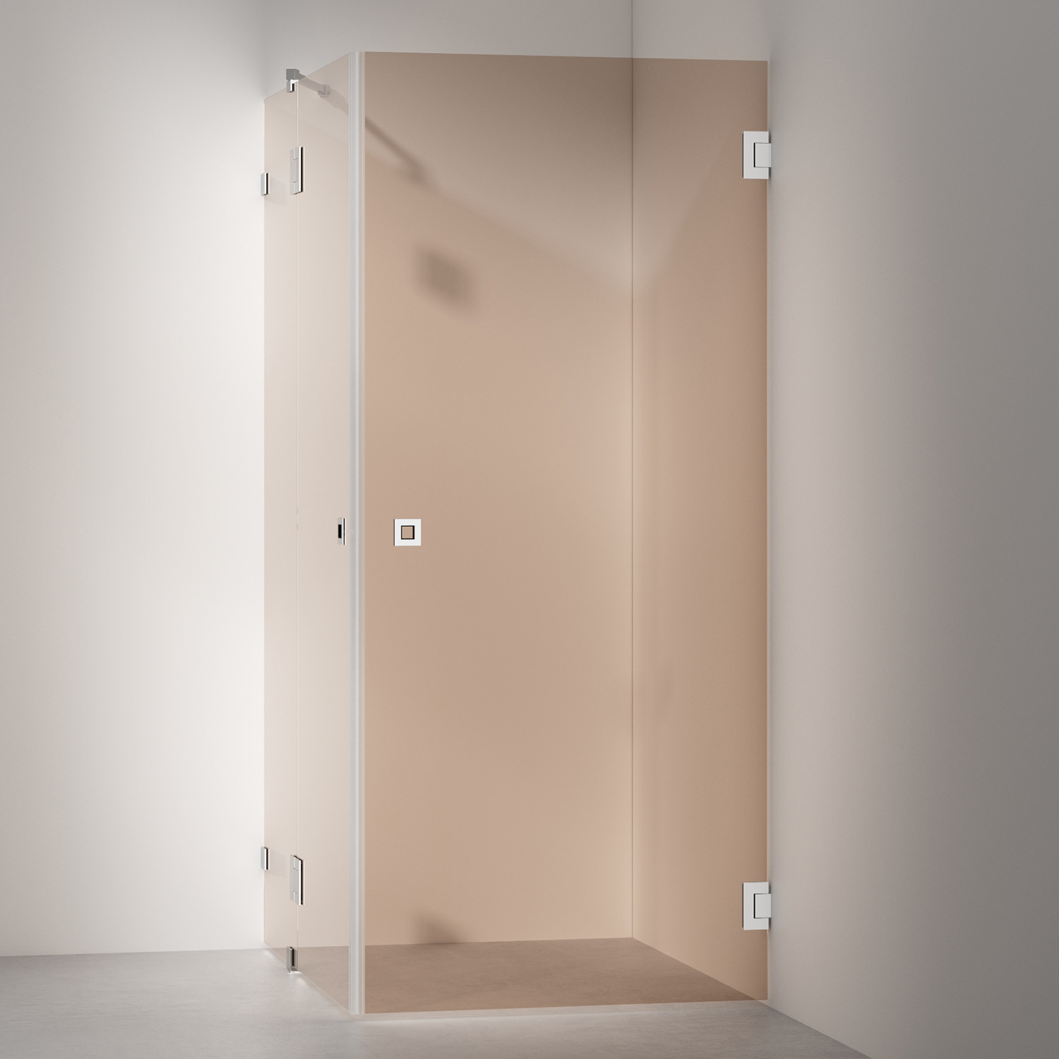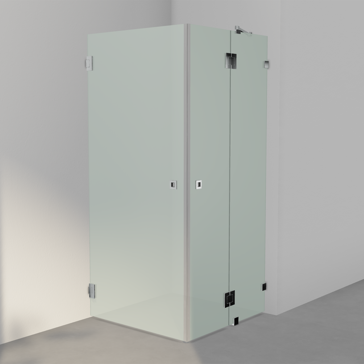 Dusjhjørne med en mindre fast vegg og to dører i 8 mm glass