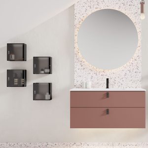 - Matt svart aluminium (RAL 9004, glans 30) med dør i Dark frost akryl