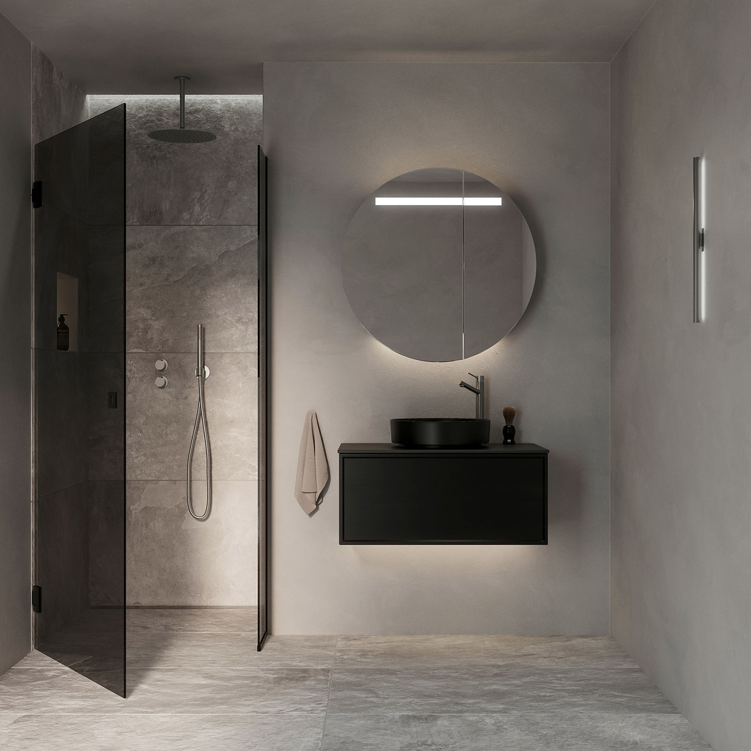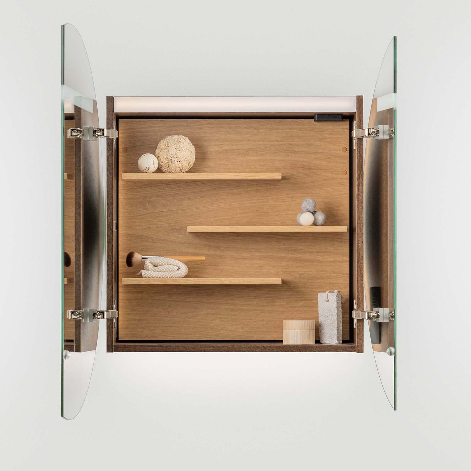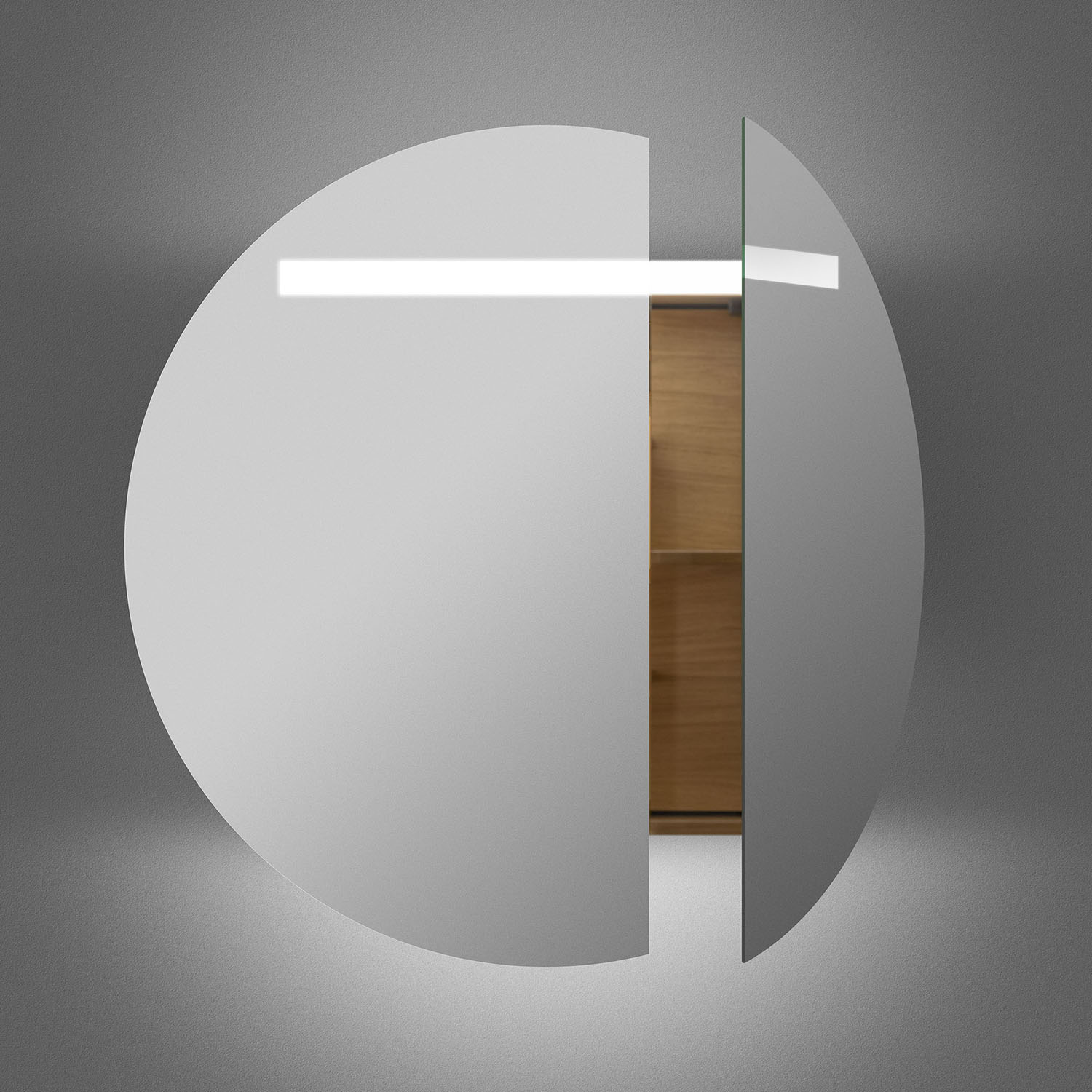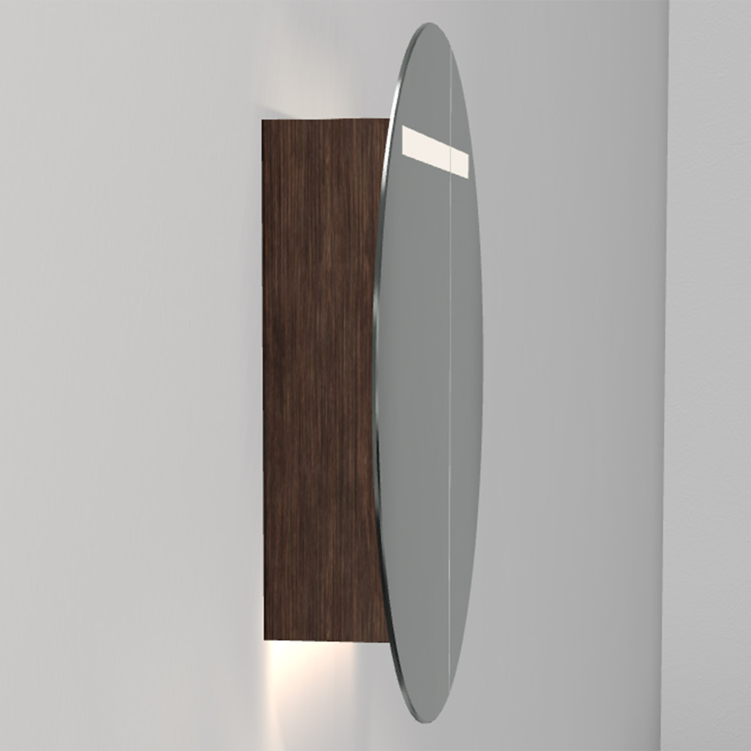 Circ er et eksklusivt og luksuriøst speilskap med delt rundt speil. Speilskapet finnes i samme finérer som møbelserien Air, samt i hvit og Accent/NCS. Baksiden og hyllene inni skapet kommer alltid i Natural Oak. Circ har innvendig belysning og et touchpanel på høyre utside hvor du regulerer lysstyrke og fargetemperatur på. Slå av lyset og kom tilbake til samme innstilling neste gang du slår på. Stikkontakt og magnetholder for småting er inkludert.