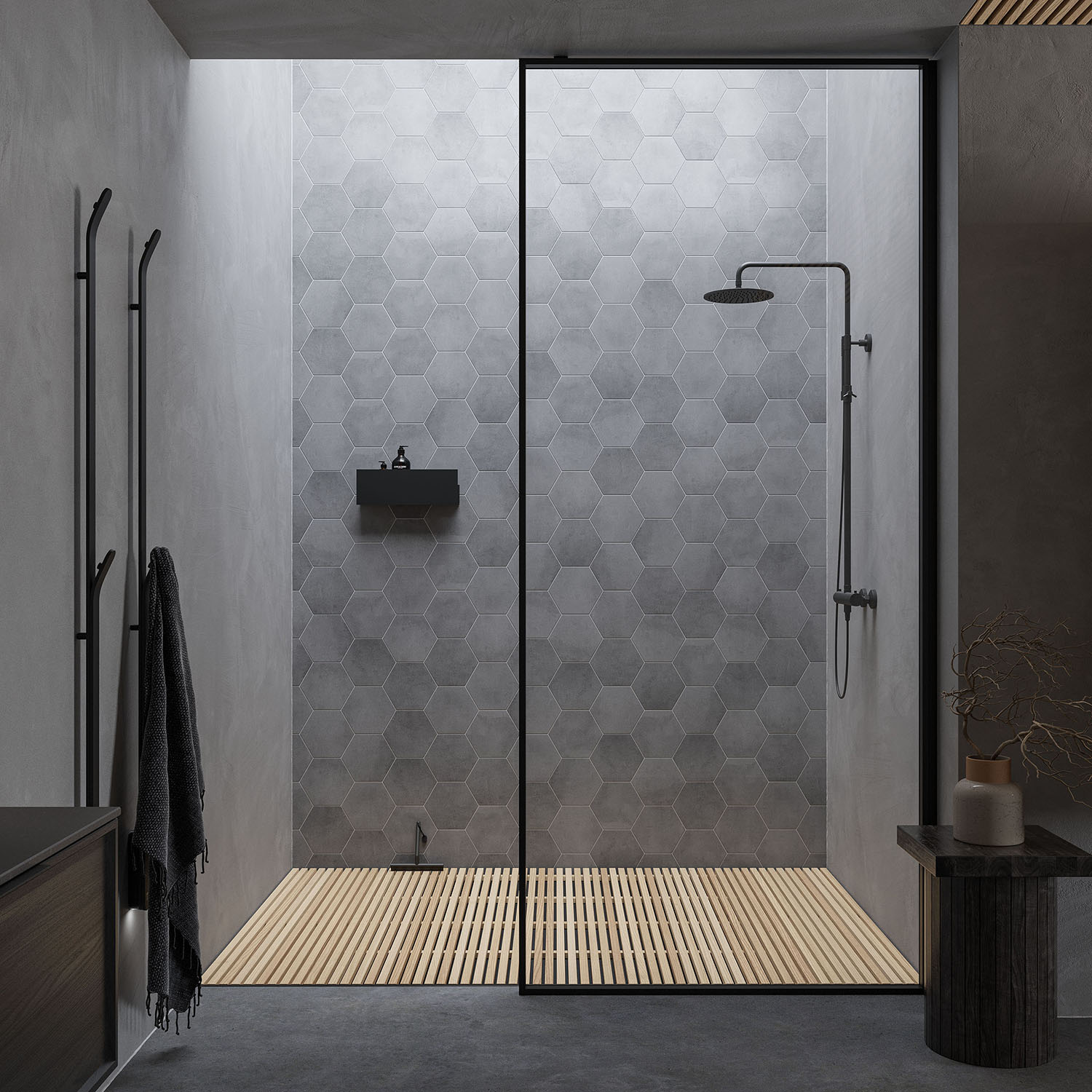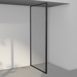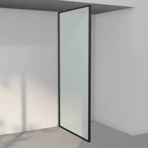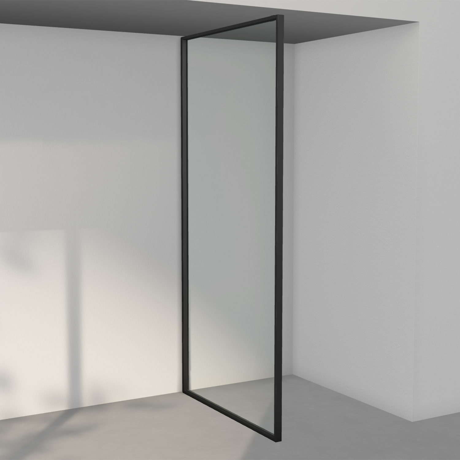 Hjørnene på rammen er i massiv aluminium med innovativ konstruksjon som skjuler alt som ikke er estetisk. Modellene med dør løfter elegant ved åpning og lukker tett mot gulvet takket være skjulte og utskiftbare tetninglister innfelt i rammen.