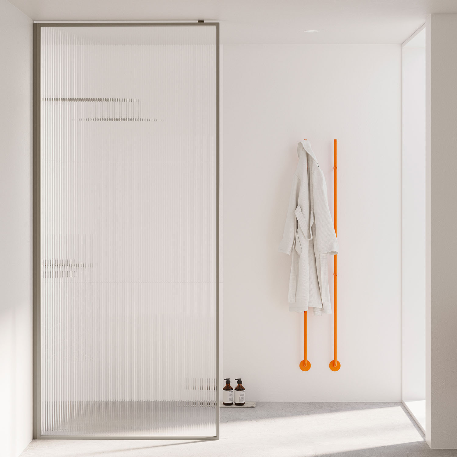 Det unike konstruksjonen til rammen skaper et sofistikert skyggespill mot veggen. Glasset vender innover i dusjen, noe som framhever den utvendige formen på rammen og forenkler rengjøring. Navet i Edge er hengslet med aksel i rustfritt stål – et utmerket eksempel på perfeksjonen i mekanikken som kjennetegner serien. Alle INRs dusjglass er herdet, noe som gjør dem betydelig sterkere enn vanlig glass.