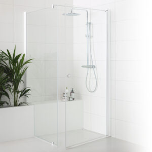 Dette dusjhjørnet består av en fast vegg på den ene siden og en dør i 6 mm tykt glass på den andre. Svenskproduserte LINC 13 Original fås i faste standardmål, men også i måltilpasset utførelse. Kombiner gjerne med den smarte oppbevaringsløsningen PILE, som integreres rett i veggprofilen. Monter dusjen på tradisjonelt vis eller borefritt med SAFE-FIX uten å lage hull i tetningssjiktet. LINC er Svanemerket og 100 % resirkulerbar.