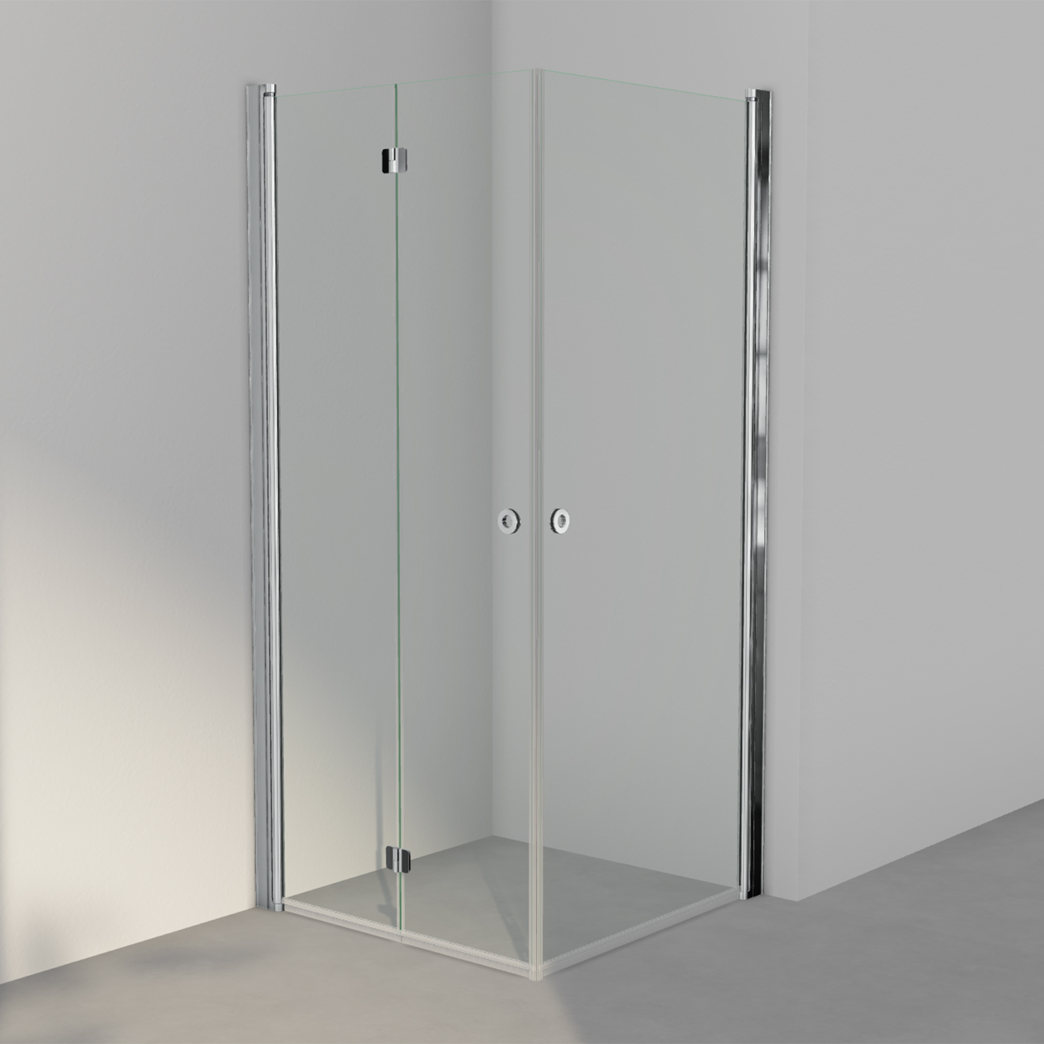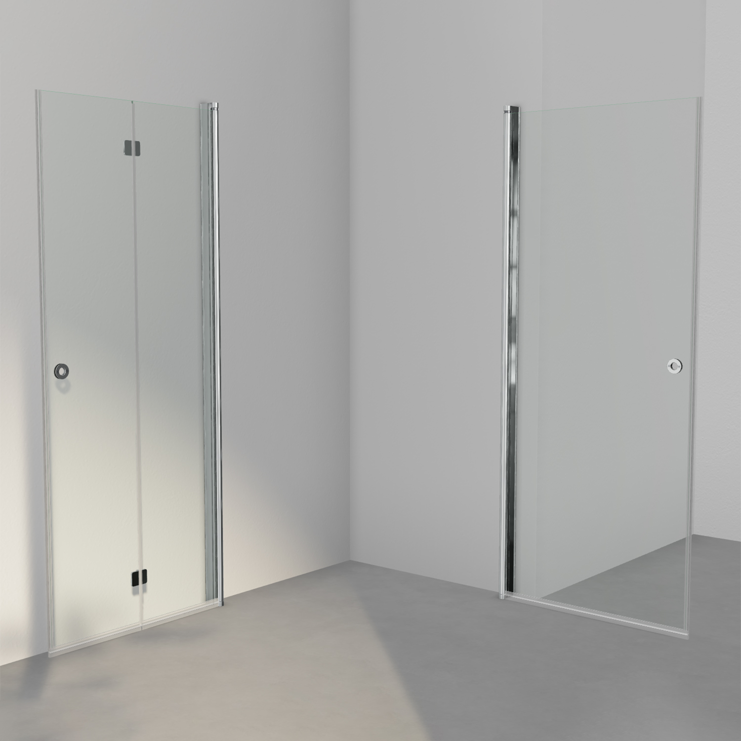 Dusjhjørne med en svingbar dør og en foldedør i 6 mm glass.