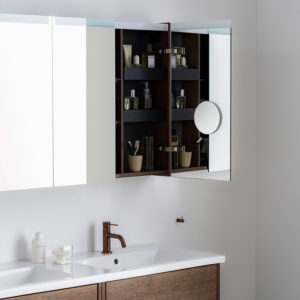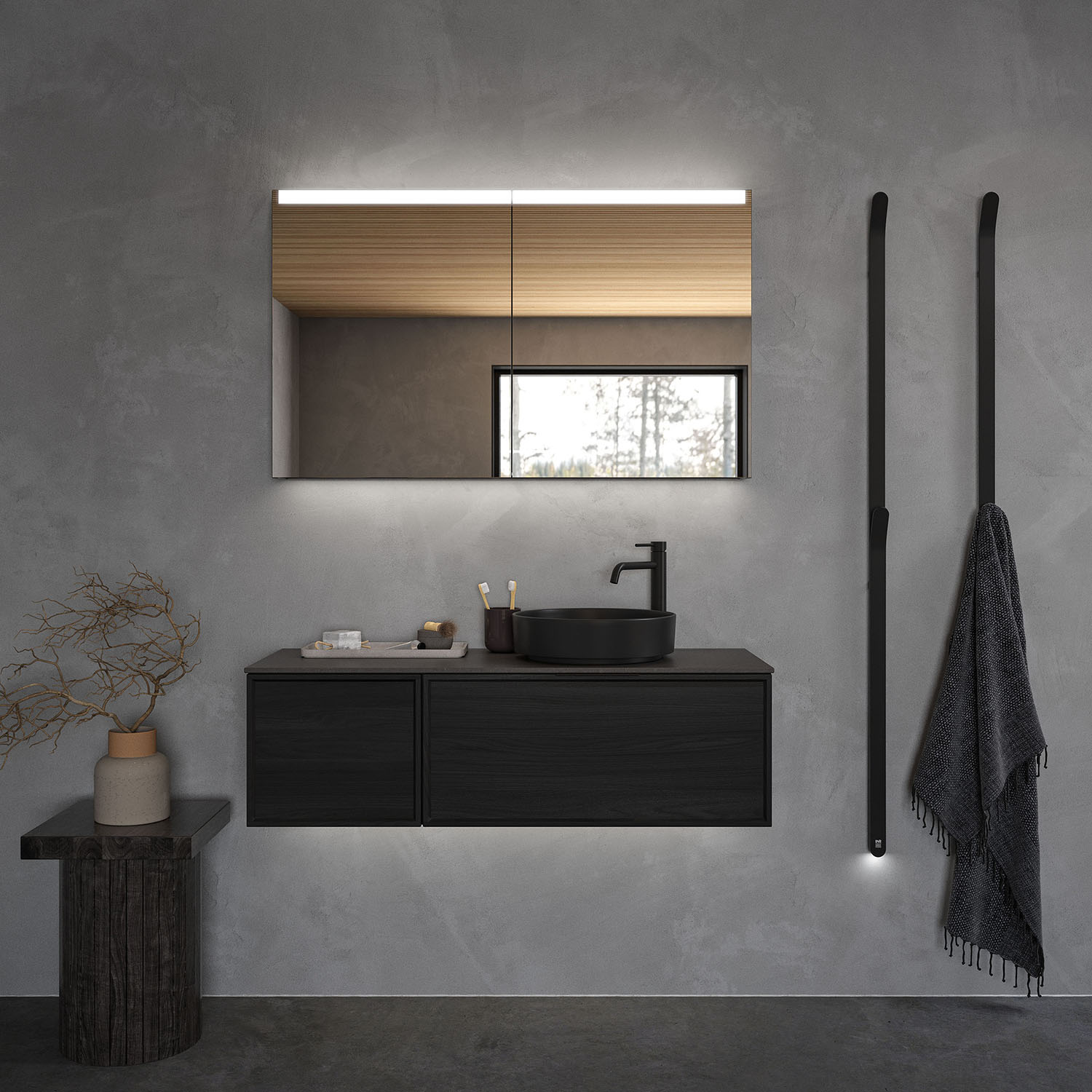 Stage Plus er INRs mest utstyrte speilskap. Samme funksjoner og tilvalg som speilskapet Stage. Plus-modellen kommer med innvendig belysning samt et touchpanel på venstre utside hvor du kan regulere lysstyrke og fargetemperatur. Slå av lyset og kom tilbake til samme innstilling neste gang du slår på. I breddene 80-120 cm kommer speilskapet med en strømseksjon med flyttbare hyller som er perfekte for oppbevaring av småting. Tilvalget Plus Zoom gjelder forstørrelsesspeil x5 på innsiden av speildøren.