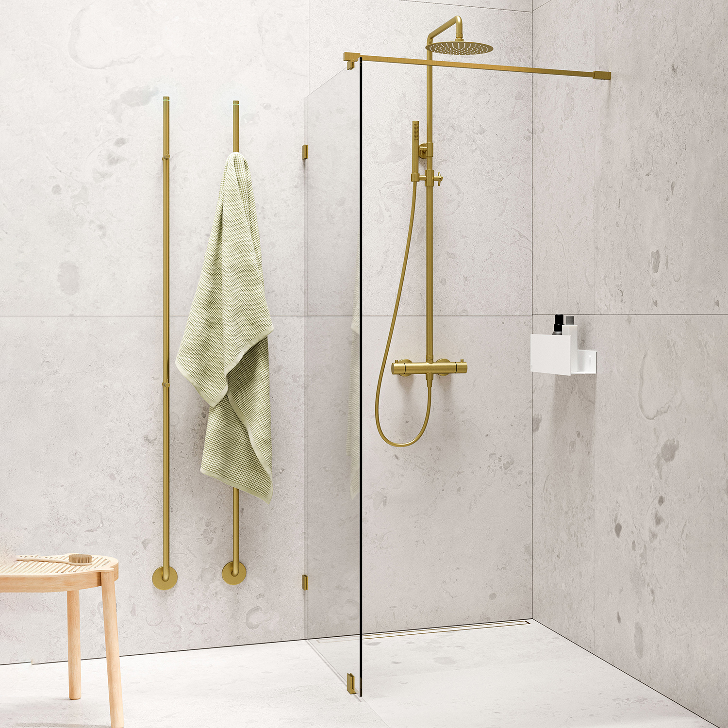 Perfekt fargetilpasset dusjserie Arc Original, håndkletørker Line og tilbehørene i INR by Primy.