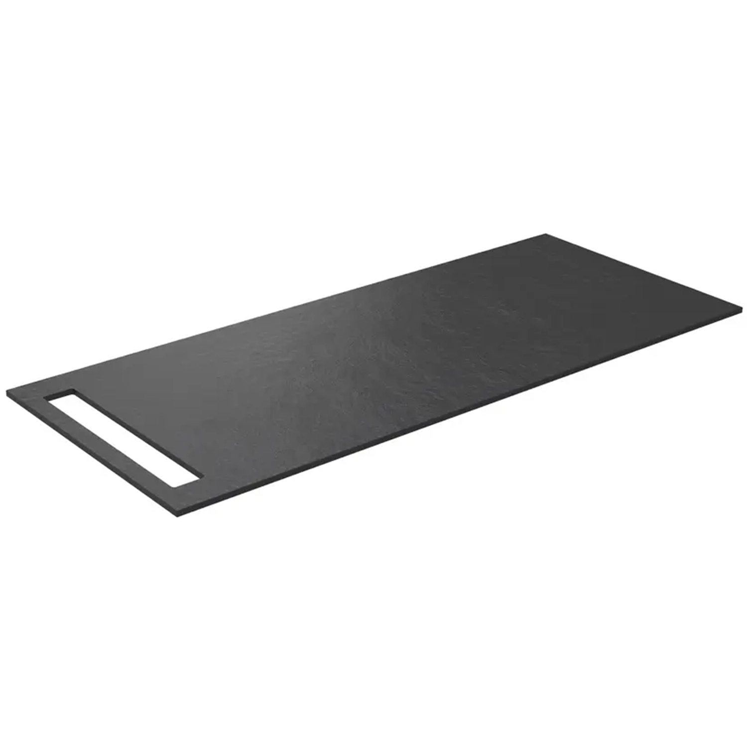 HPL benkeplater er gjennomfarget og har et skiferlignende mønster på toppen. Denne modellen har også en smart åpning med plass til håndkle på siden. Platen er vendbar slik at håndkleholderen kan være enten på venstre eller høyre side. Alle møbelseriene kan settes sammen med to servantskap under en lengre benkeplate. Da får man plass til to servanter på toppen eller en servant og litt ekstra benkeplass på siden. HPL-plater tåler maks 10kg på toppen og det er derfor ikke mulig å ha tunge steinservanter på denne type plater.