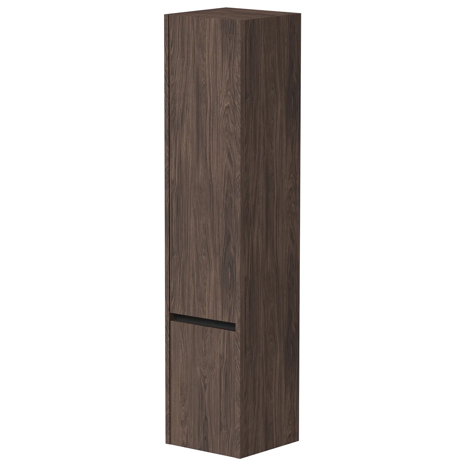 Eris høyskap i brun eik tilfører baderommet en varm og naturlig atmosfære. Overflaten i brun eik har en dyp, rik fargetone som kombinerer moderne eleganse med tidløs sjarm. Sorte aluminiumslister mellom de grepsfrie dørene fremhever skapets varme design og bidrar til et helhetlig uttrykk.