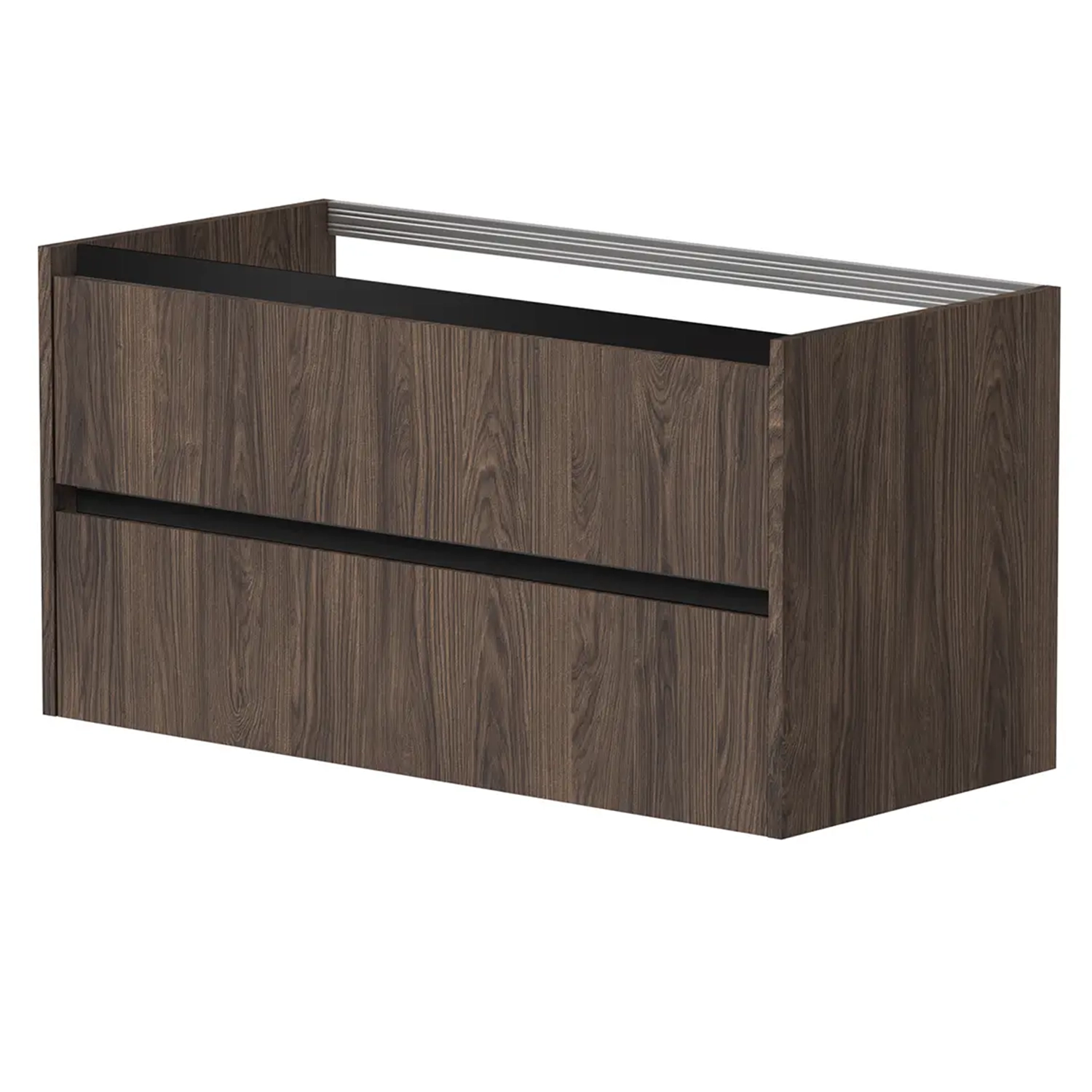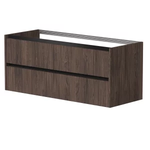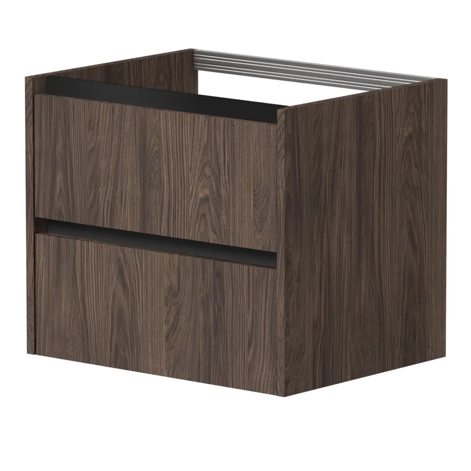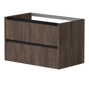 Eris servantskap i brun eik, gir et varmt og sofistikert preg til baderommet. De sorte aluminiumlistene på skuffene fremhever den naturlige eikefargen. Servantskapet har en praktisk skuff med demping for en jevn og stille åpning og lukking.