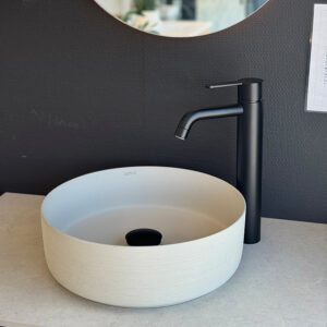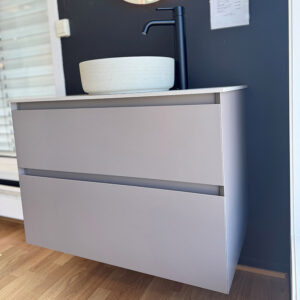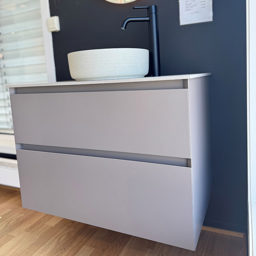Møbelpakke inkluderer: Servantskap 80 cm, benkeplate, Carnac Cru bolleservant, Blokhus Speil, Silhouet servantkran og klikkventil