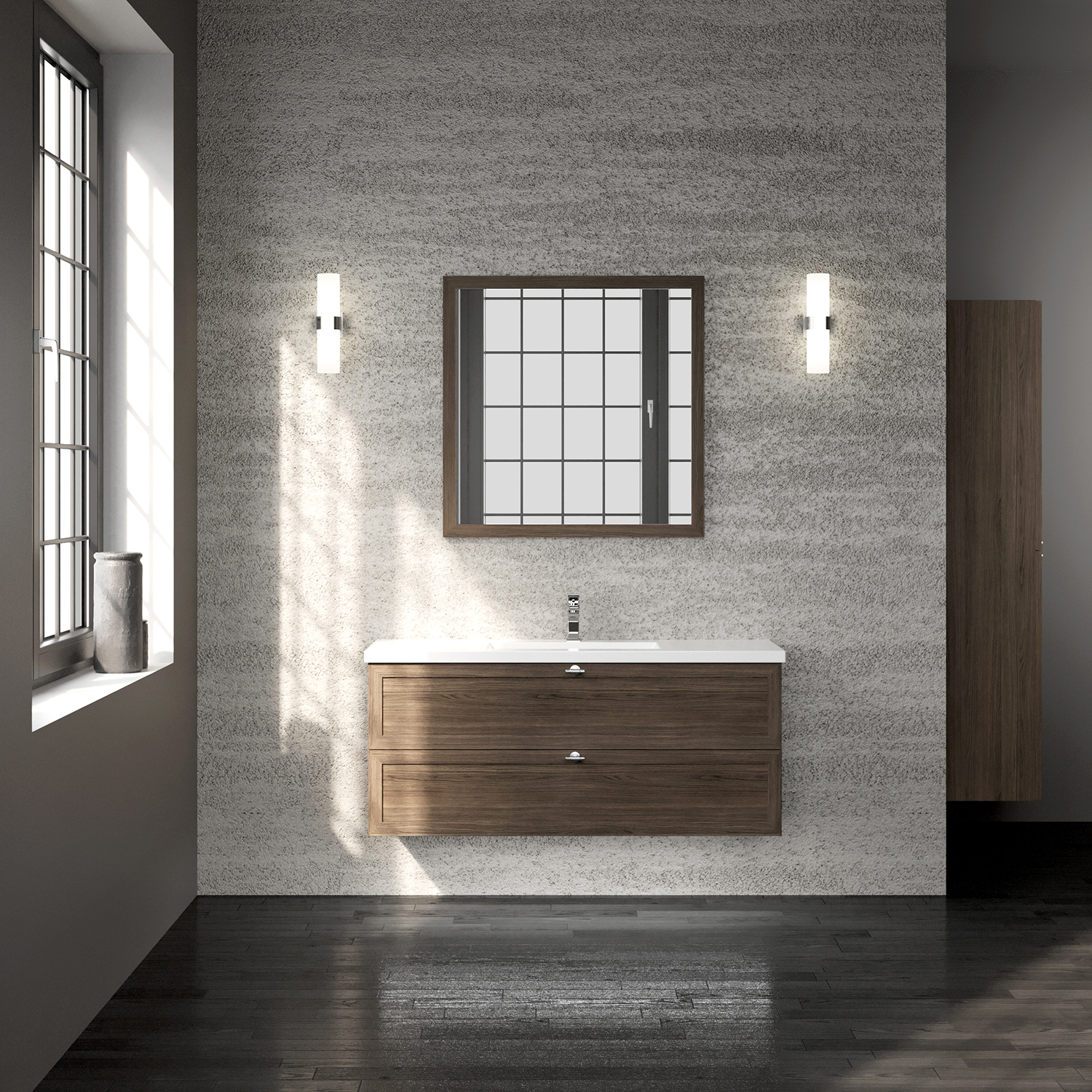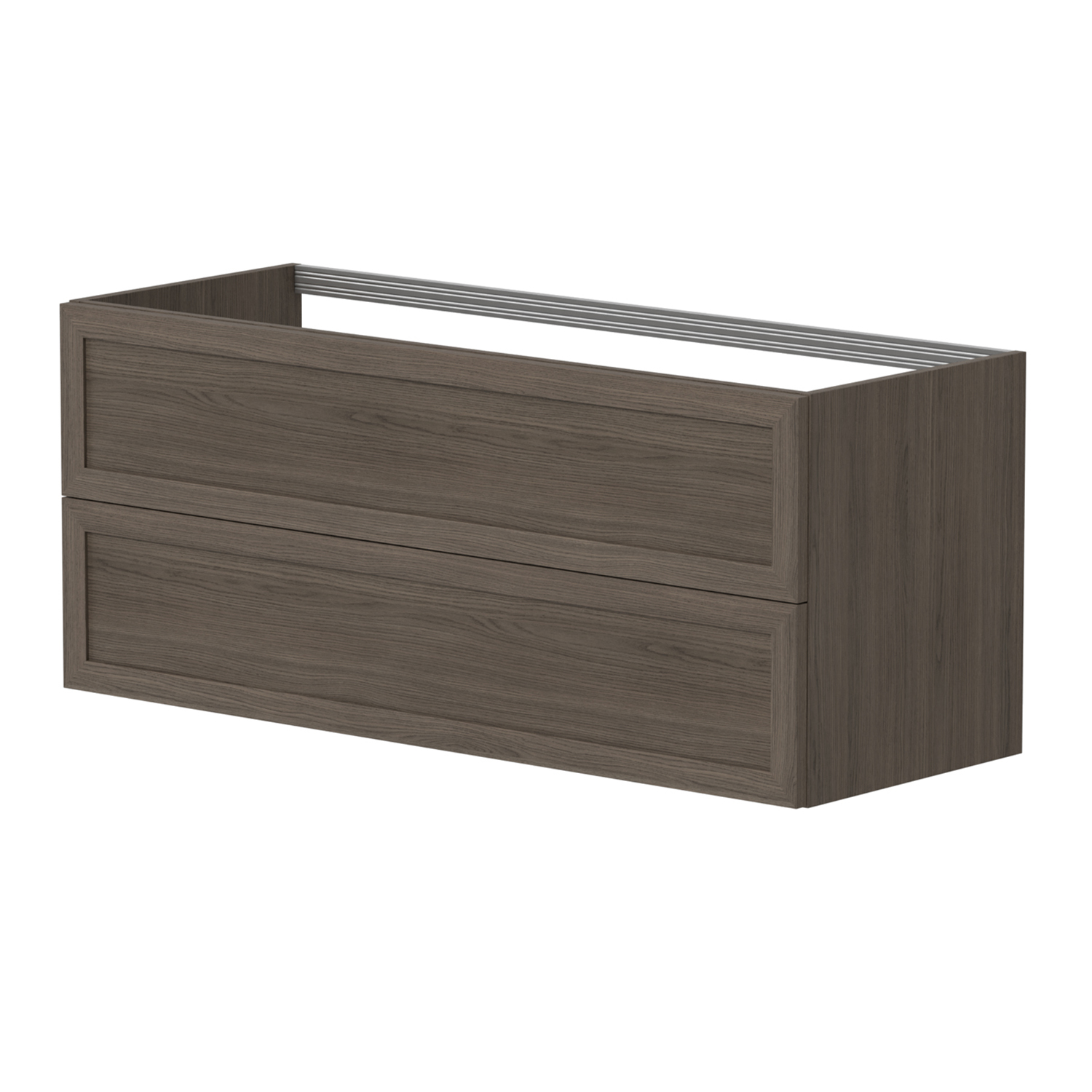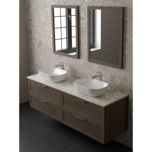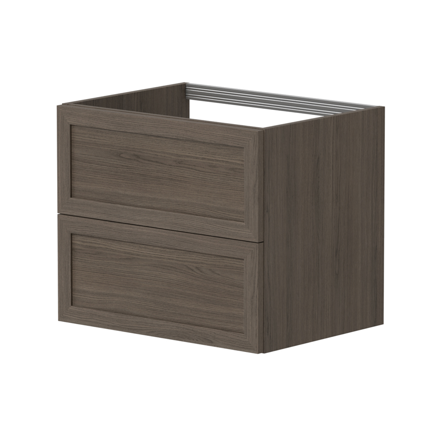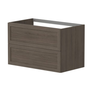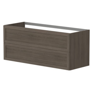 Underskapet på Rustic har en kombinasjon av heltre eik og eikefiner. Skuffene er hvite innvendig og inkluderer antisklimatter. Skinner i skuff med demping. Rustic-serien kommer med sorte matte grep inkludert. Det finnes flere andre ulike grep som kan bestilles som tillegg. Underskapet kan kombineres med benkeplate og bolleservant eller en klassisk heldekkende servant. Underskap leveres i to versjoner, servantskap som har utsparing til vannlås i den øverste skuffen og benkeskap som har hele skuffer både oppe og nede. Rustic-serien har høyskap med like grep som på skuffene. Høyskapet har glasshyller og dørene kan monteres høyre/venstre. Speil med ramme i heltre eik kompletterer kolleksjonen.