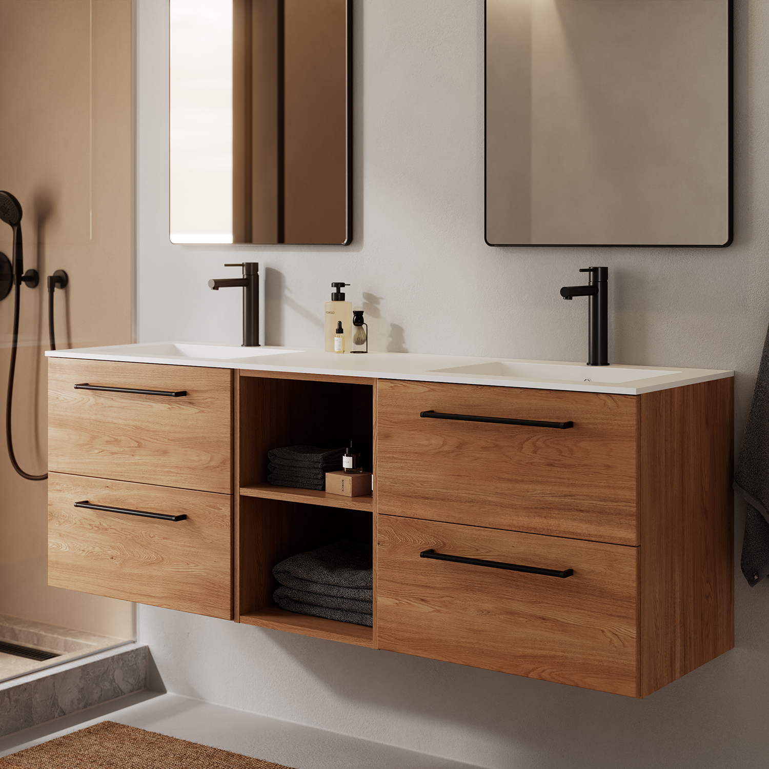 Ingrid baderomsmøbel er en klassiker – nå kommer den også i eikefinér. Det gir et eksklusivt preg til ditt baderom. LinnBad tilbyr et stort utvalg av modeller og størrelser, slik at du kan skape det perfekte badet etter din egen smak. Nå har du muligheten til å velge mellom ulike grep. Det gir deg en unik mulighet til å tilpasse møbelet etter din personlige stil og preferanser. La deg inspirere og lek deg fram til ditt drømmebad med Ingrid, enten du velger eikefinér eller folie. Kombinasjonen av tidløs klassisk design og moderne fleksibilitet gjør Ingrid til det opplagte valget for et perfekt baderom. Ingrid leveres som standard med skrog og front i samme farge, men du har også muligheten til å skape din egen unike kombinasjon av skrog- og front farger uten ekstra kostnad.