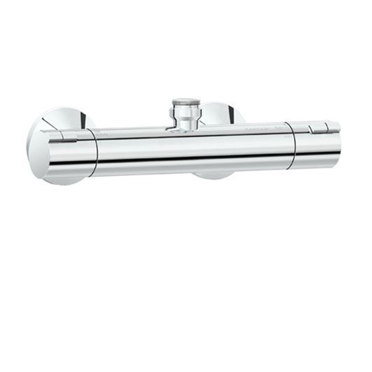 Pen og enkel termostatkran med skoldesperre og eco-savefunksjon. 3/4″ tut opp for feste av dusjrør direkte på termostat.