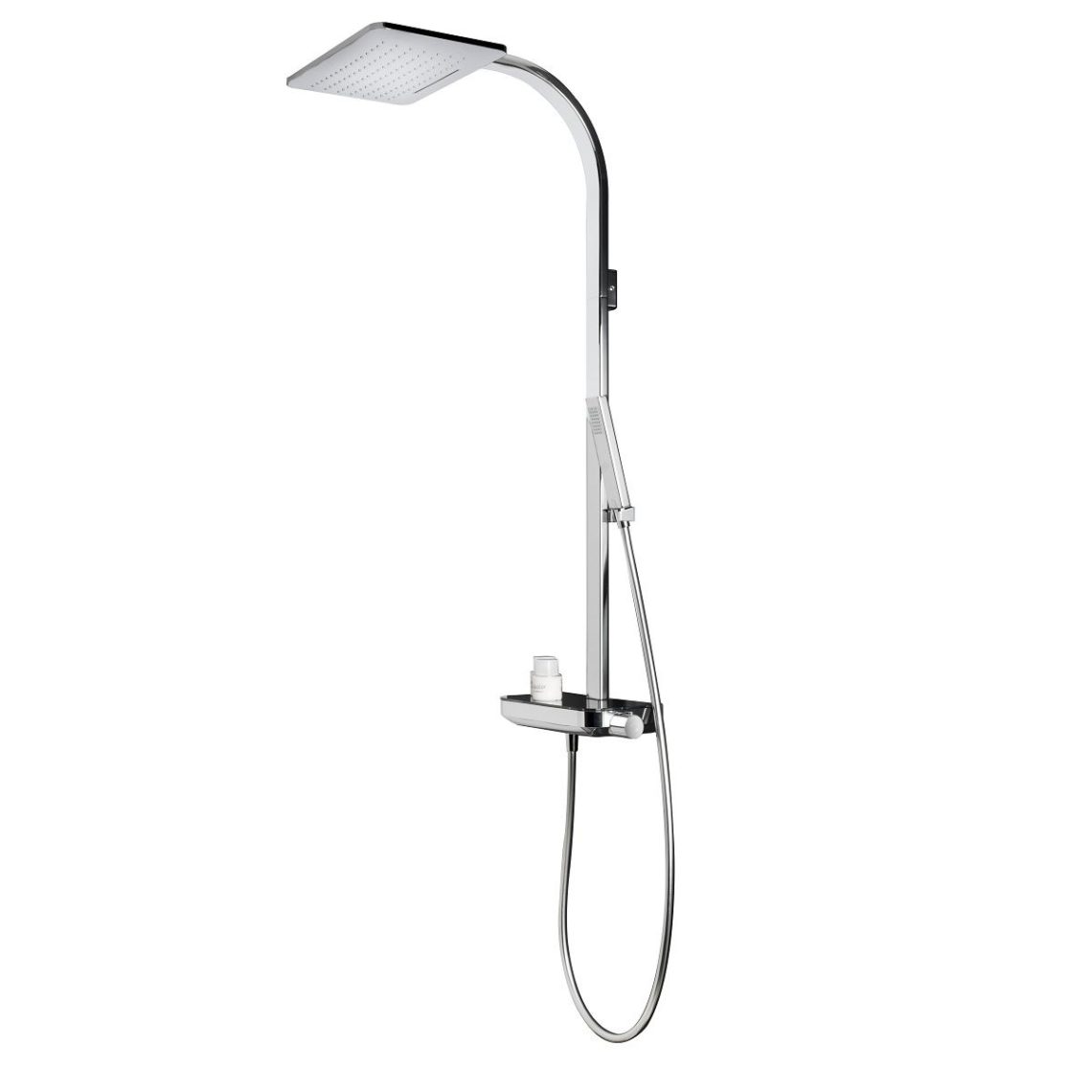 Takdusj med stort firkantet takdusjhode, velg mellom vanlig stråle eller fossefall. Hånddusj med fastmontert feste. Termostatkran med hvit glassplate med plass til shampoflasker mm.