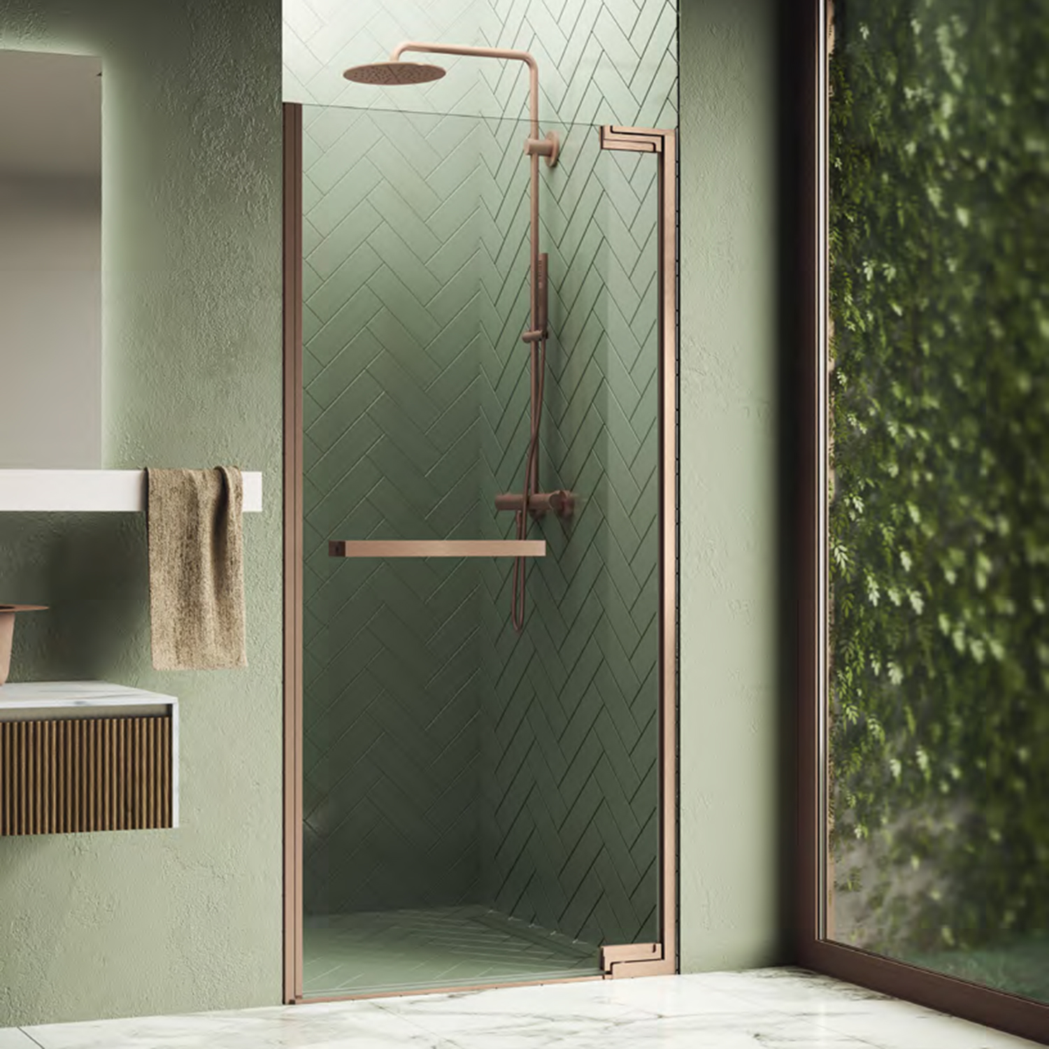 Hengsler inn/ut med 90 grader åpning begge veier. Med tykt glass på 8 mm og soft close med magnet for dempet lukking av døren, er N180-serien ett perfekt produkt i Korsbakkens Exclusive serie. Velg mellom profiler i 7 PVD-behandlede overflater: Krom, sort matt, hvit matt, messing, børstet messing, børstet sort eller børstet kobber profiler.