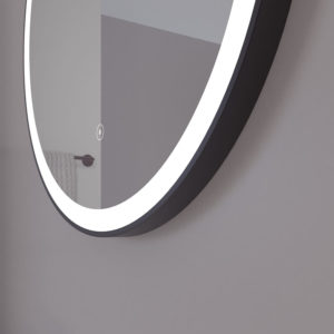 Rundt speil med sort ramme i metall og frostet kant med LED-belysning. Produsent: Loevschall A/S
