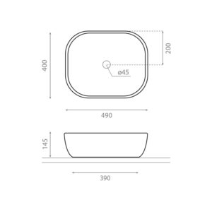 Porselensservant i ekstra tynt porselen med flotte avrundede hjørner. Uten overløp. Mål: 490 x 400 x 145 mm.