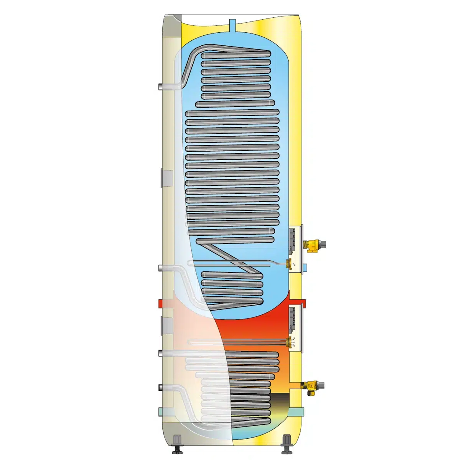 OPTIMA TWINCOIL – OTC dekker varmtvannsbehovet for ca. 6 personer og varmebehovet i boliger opptil ca. 400 m² i en enkelt enhet. OPTIMA TWINCOIL passer for varmepumpe med varmtvannsprioritering inntil 15kW, vha. den store heteflaten (2,6 m²) på varmeveksleren i varmtvannstanken. Rustfri buffertank på 85 L med mulighet for tilkobling mot ≤ 12 m² solfangere vha. ytterligere en varmeveksler (0,7 m²), samt 9kW el-driftsmulighet gir varmepumpen optimale driftsforhold og full energifleksibilitet for fremtiden. OTC har elektrisk varmeelement i bunn av tanken for sikring mot bakterievekst (styres eksternt). Elementet kan også brukes som nødvarme for VP. Blandeventil kan enkelt ettermonteres som tilleggsutstyr.