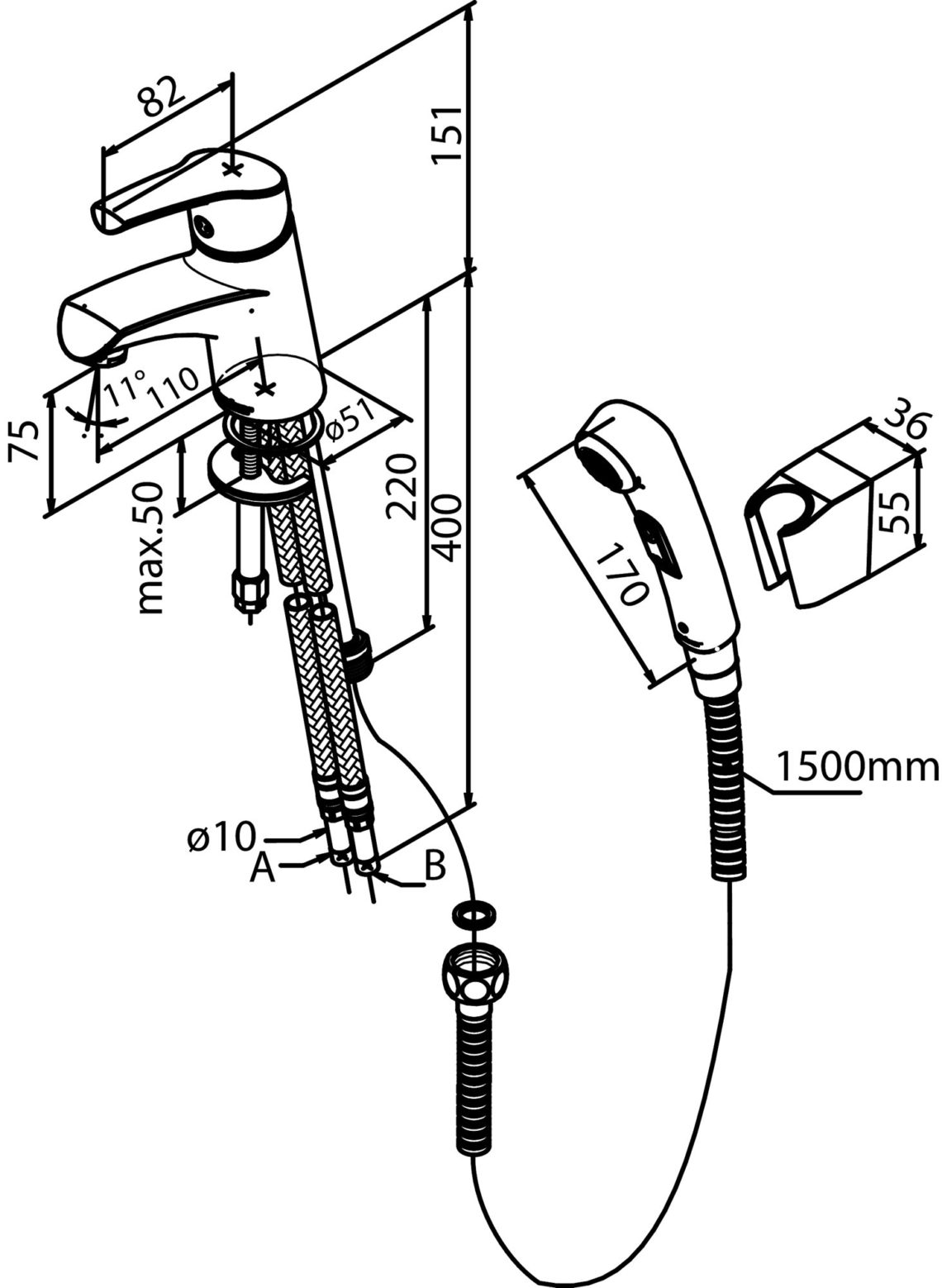 Serie med pene avrundede former. Kjedefeste. Sidedusj med slange 150 cm.