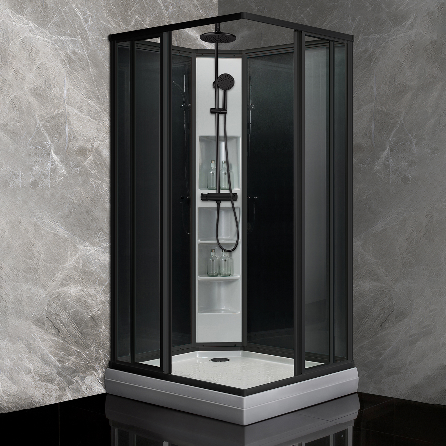 Meget enkel montering og lett å holde ren. Classic sort leveres med matt sorte profiler, sotet glass i bakveggene og grå dusjbunn og hjørnesøyle. Frontglass i klart glass. Justerbare ben og avtagbart frontpanel. Classic leveres enten som BASIC-modell uten takdusj, eller PLUS-modell med takdusjsett og armatur i matt sort finish.