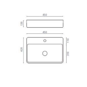 Porselensservant med overløp. For montering på vegg eller plate. Tynt porselen med pene avrundede hjørner.