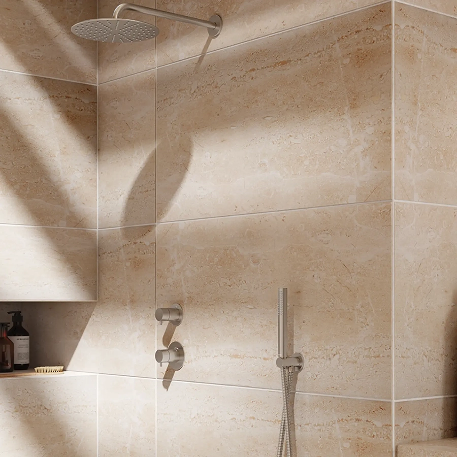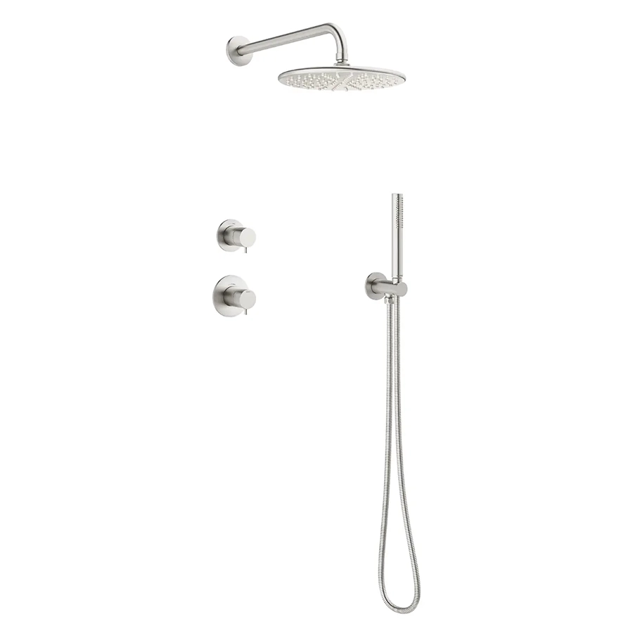 Silhouet DS1 er utstyrt med en termostatstyrt løsning og en praktisk vender, som gjør det enkelt å bytte mellom takdusj og hånddusj. Både termostat og vender er montert på rosetter, som bidrar til et rent og stilrent design. Dusjhodene er utstyrt med Rub-clean, som gjør rengjøring enkelt – dra fingeren over gummidysene for å fjerne kalk og opprettholde en jevn dusjstråle. Takdusjen har en veggmontert dusjarm for enkel og plassbesparende montering.
