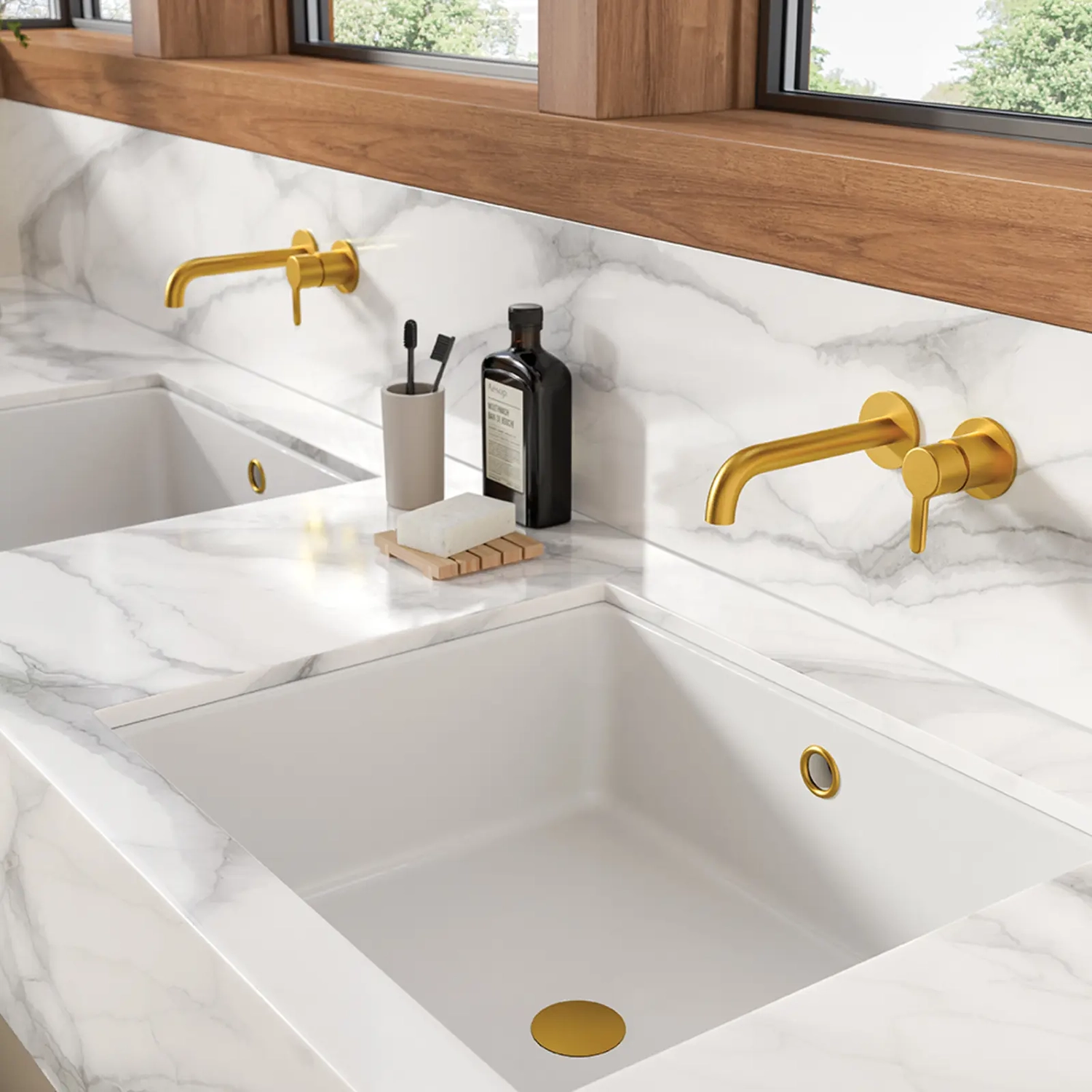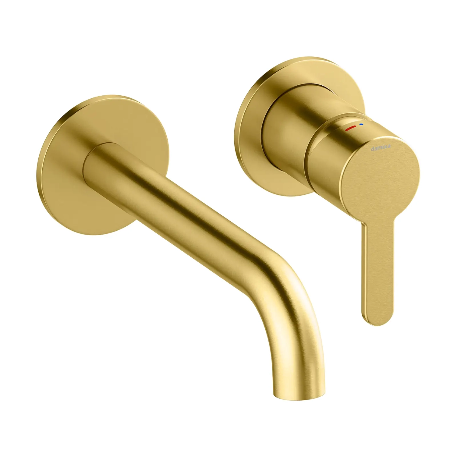 Silhouet servantkran for innbygging i PVD-behandlet børstet messing gir et eksklusivt inntrykk, og er et blikkfang når du går inn på badet. Servantkranen har rosetter montert i veggen for et rent, moderne og eksklusivt uttrykk på badet.