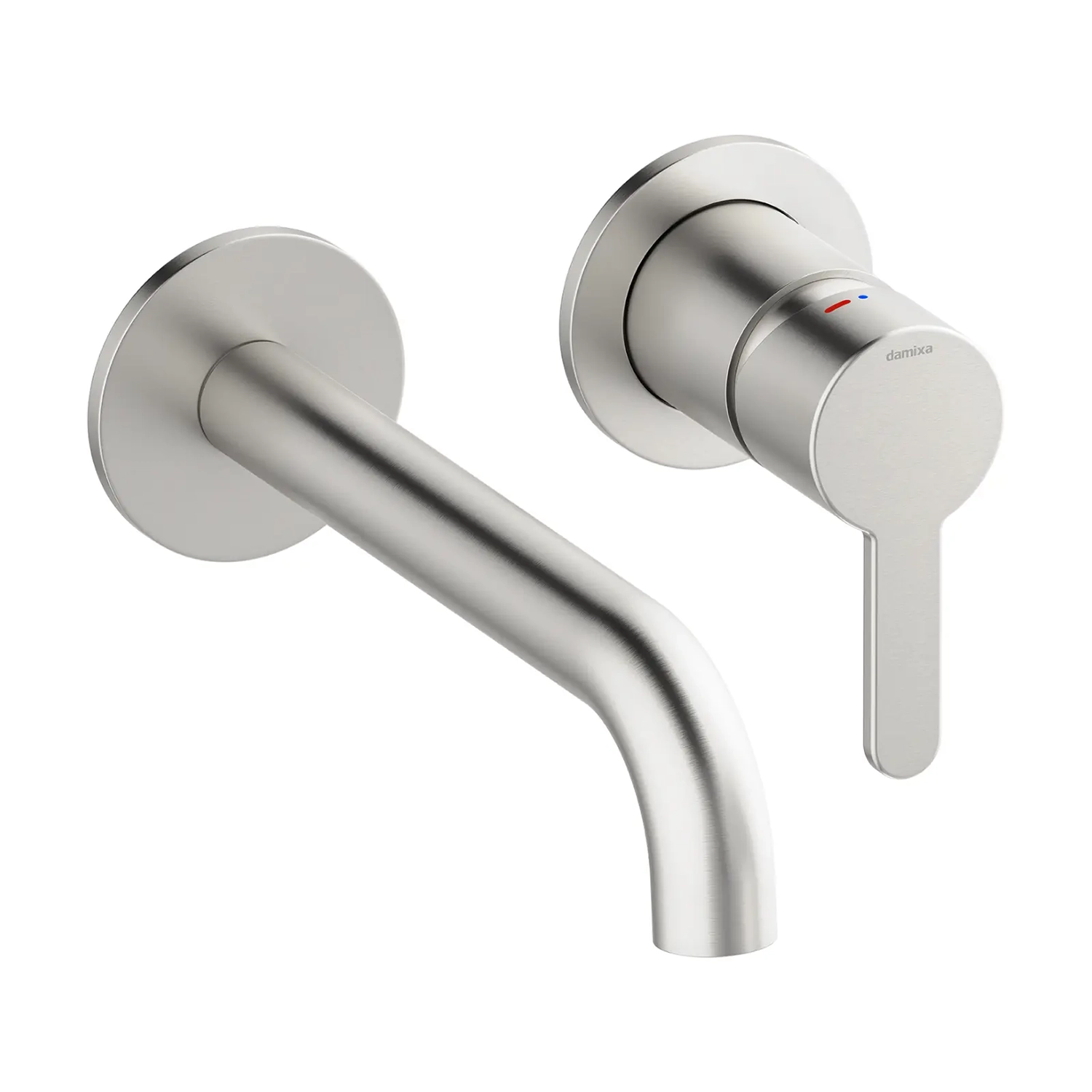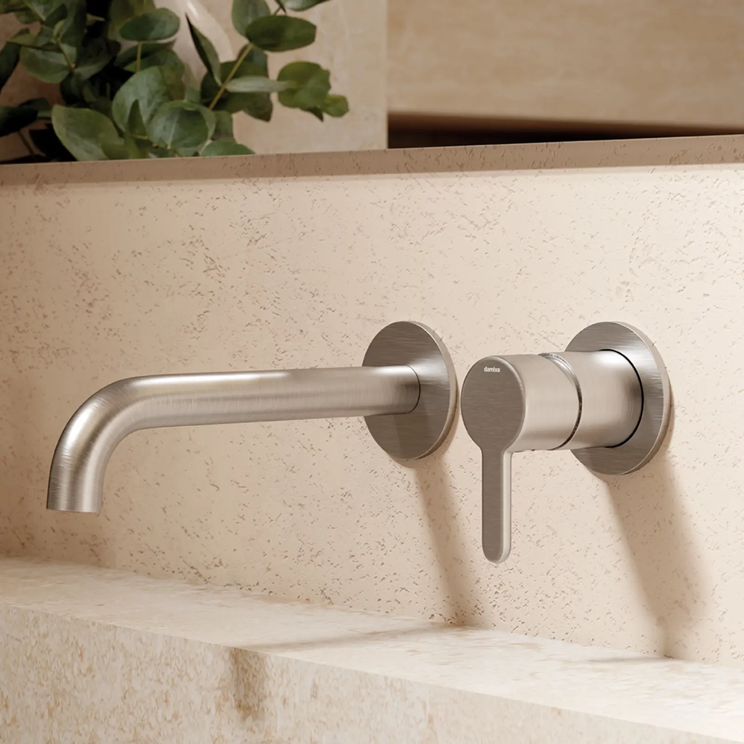 Silhouet servantkran for innbygging i børstet stål for en elegant, men tidløs finish på badet. Servantkranen har rosetter montert i veggen for et rent, moderne og eksklusivt uttrykk på badet.