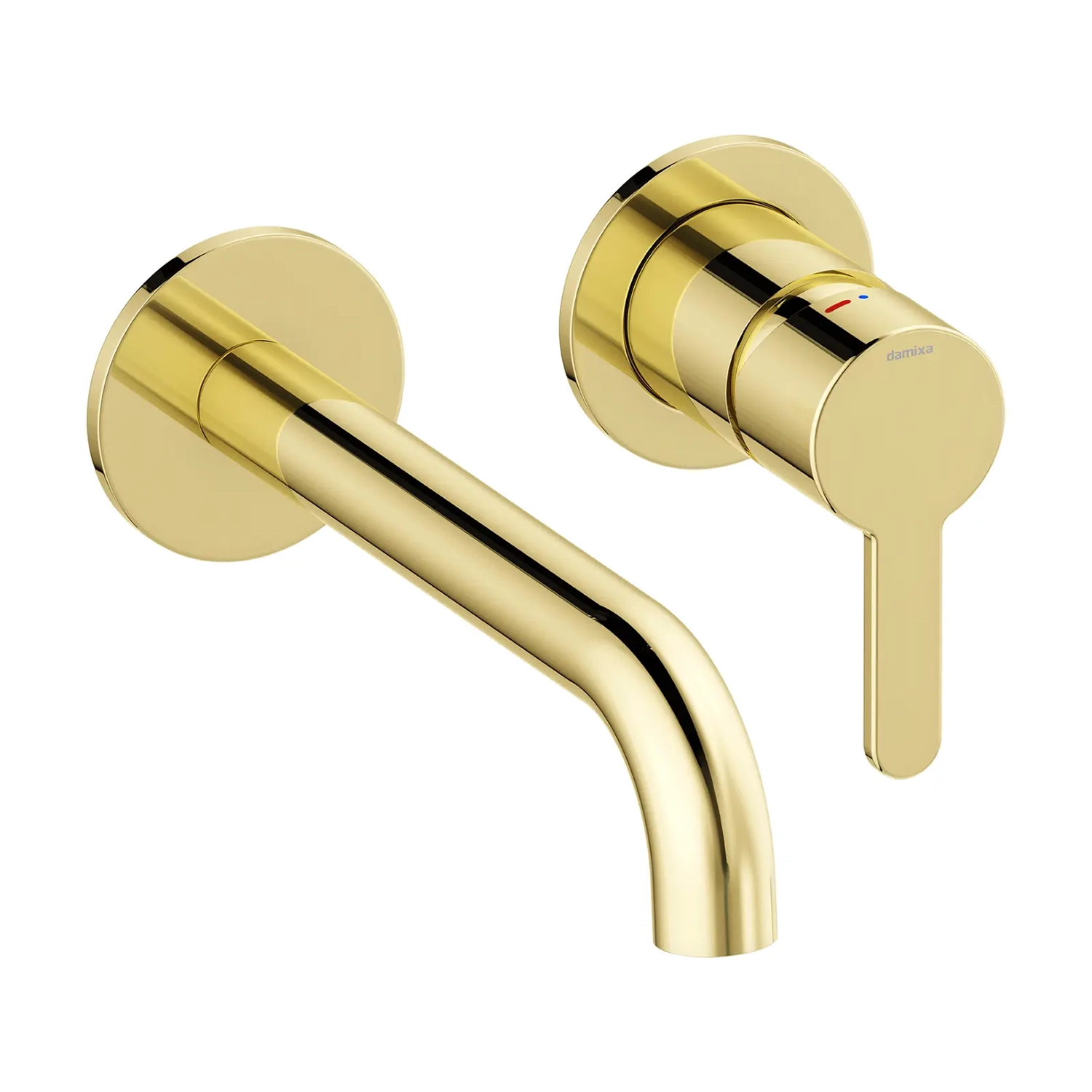 Silhouet servantkran for innbygging i PVD-behandlet messing gir et blikkfang på badet med sin elegante iøynefallende overflate. Servantkranen har rosetter montert i veggen for et rent, moderne og eksklusivt uttrykk på badet.