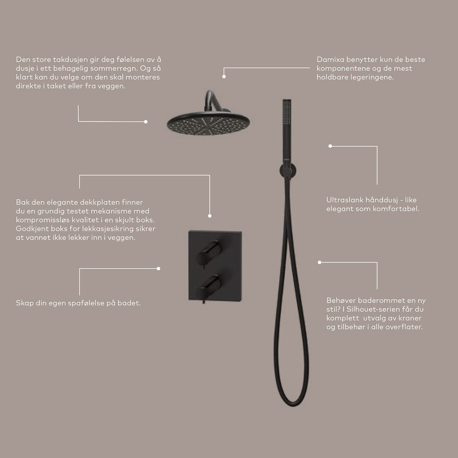 Ønsker du en ren, minimalistisk og eksklusiv dusjsone? Med Silhouet innbyggingskran fra Damixa får du en perfekt kombinasjon av funksjonalitet og estetikk. Den blanke kromoverflaten gir badet et tidløst, stilrent og elegant uttrykk, mens designet uten synlige skruer bidrar til et moderne og ryddig utseende.