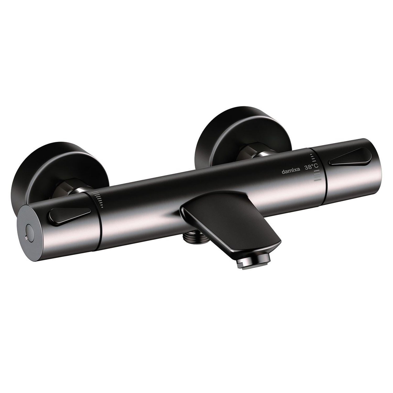 Termostatkran for badekar med eco-save og skoldesperre. Ekstra holdbar børstet grafitt PVD behandlet overflate. Rub-clean på tut for enkel fjerning av smuss.
