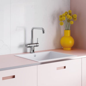 Sensorstyrt kjøkkenkran kombinert med muligheter for manuell bruk av hendel. Enkel justering av styrke og varme på vann.