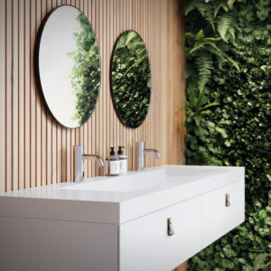 Berøringsfri servantkran med mulighet for manuell innstilling av temperatur og vannmengde. Beregnet for bruk i private hjem.