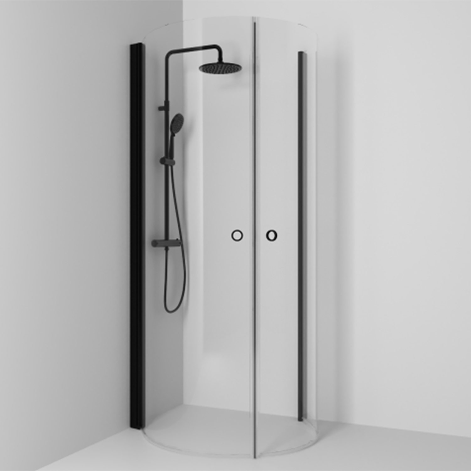 Hengslene gjør det enklere å åpne og lukke dørene, og slepelisten holder tett mot gulvet. Består av to dører som kan åpnes, med transparent tetningslist i nedkant. Kan plasseres asymmetrisk eller symmetrisk i et hjørne alternativt på vegg. Dørene kan skyves inn mot veggen når dusjen ikke benyttes, dette frigjør gulvplass. Veggprofil tilrettelagt for rørtrekking 30 mm fra vegg.