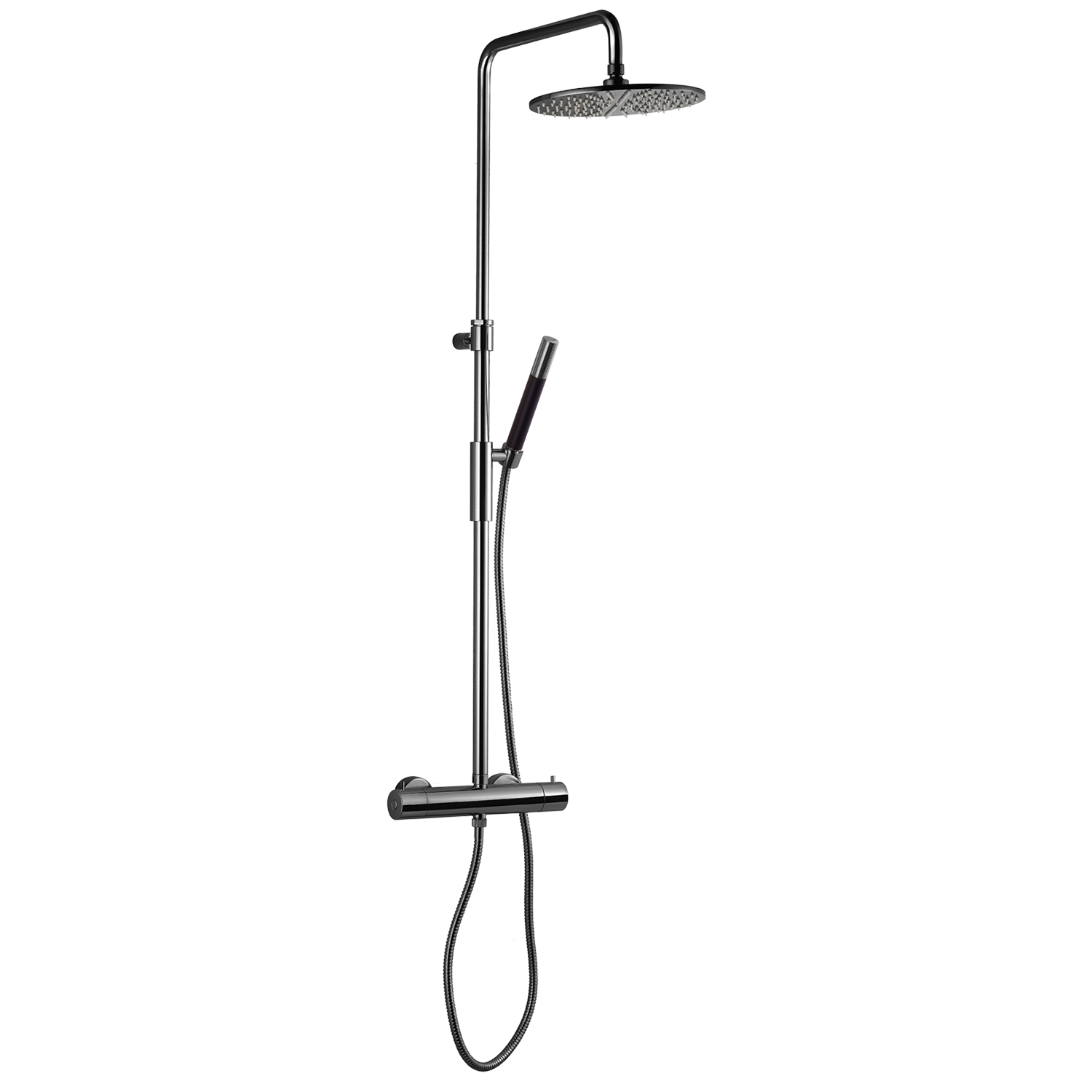 Takdusj med trykk- og termostatstyrt dusjbatteri. Teleskopstang for enkel høydetilpasning av taksilen. Black Chrome er en mørkere nyanse av krom som fører tankene til science fiction. Legeringen inneholder platina, noe som skaper en hologramlignende dybde.
